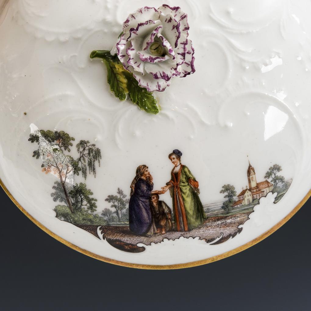 Small tureen with rocaille relief, rocaille lecterns with flower coating, flower knob lid and saucer. With various Watteau scenes, including with fortune teller, Tänzerin and Harlequin. Gold partly rubbed, flower knob minimally bumped.