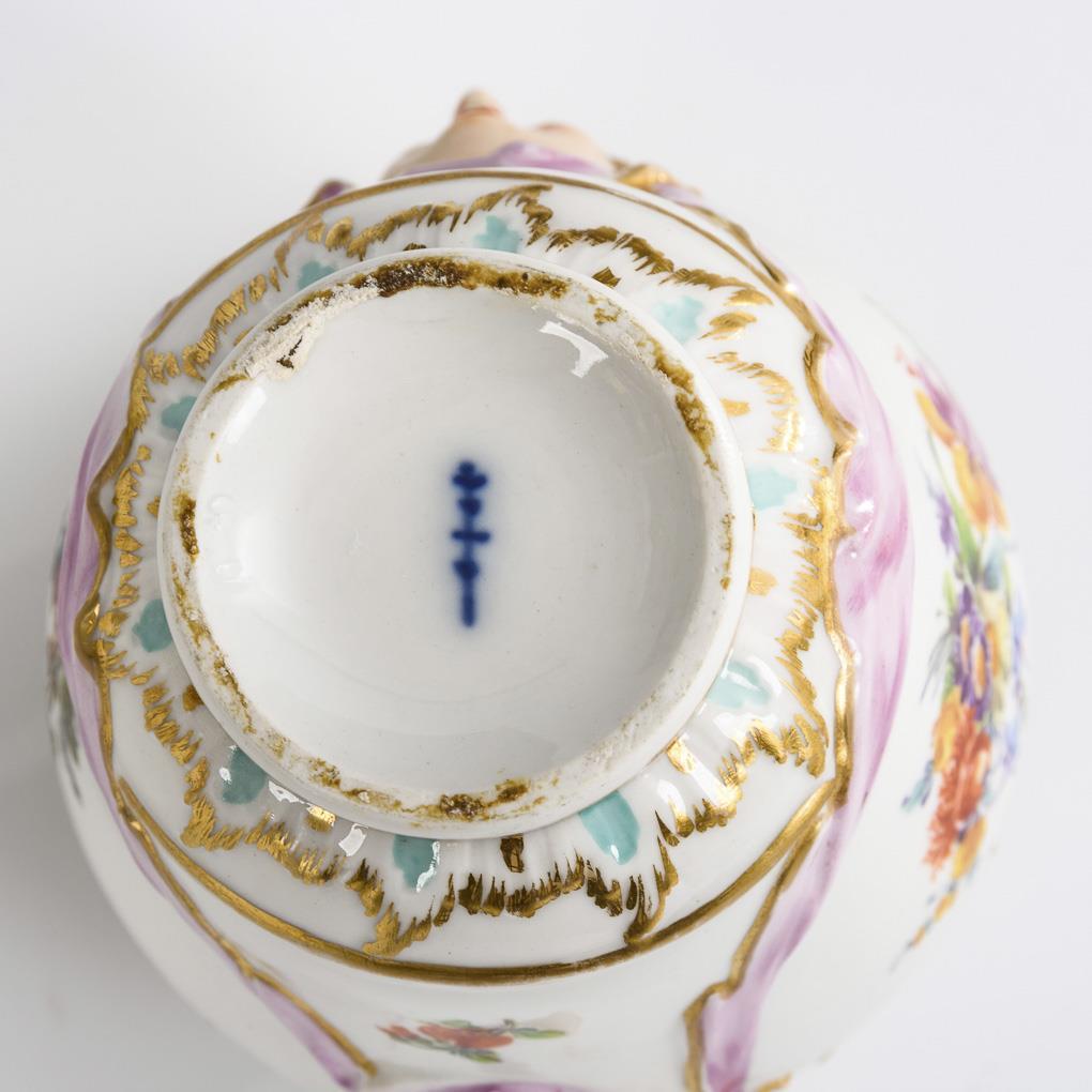 Baluster box with openwork shoulder, two handles with women's mascarons and lid with three flowers as knobs. With a Watteau depiction and floral painting. Flower of the knob restored, partial gold abrasion.