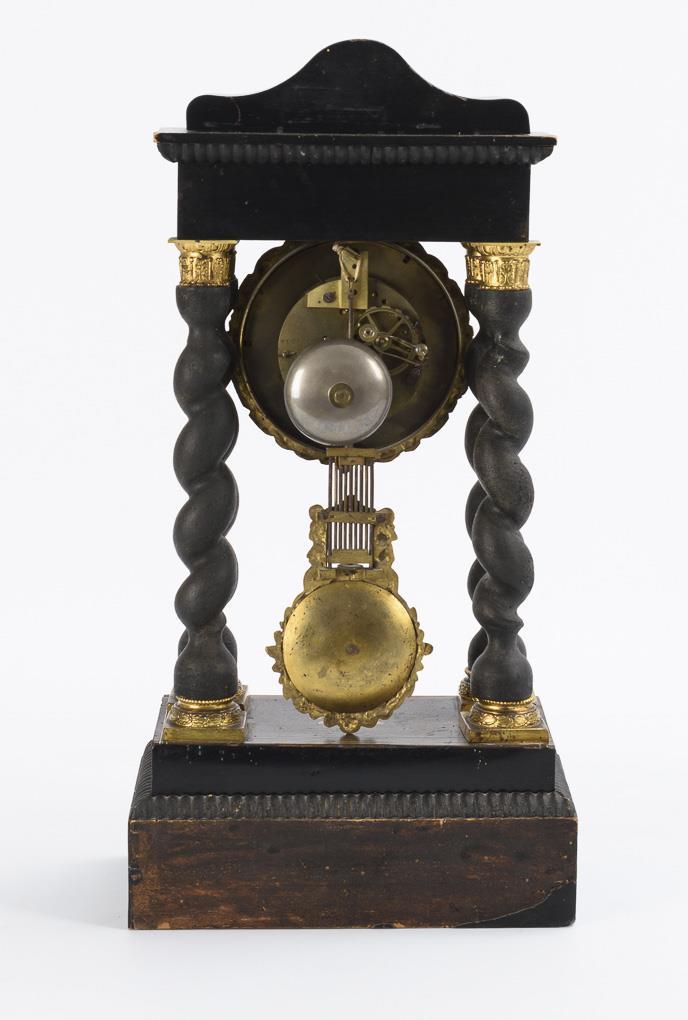 Portal form with 4 turned columns, curved pediment and stepped base. Bright floral marquetry and thread inlays, relief stained bezel and stained pendulum. Signs of age and use, base loose, defects, veneer flaws, pendulum spring defective.