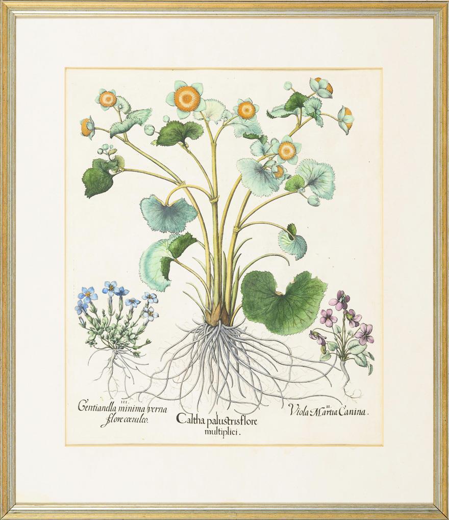 Precise depiction of a marsh marigold "Caltha palustris flore multiplici", a dog violet "Viola Martia Canina" and a spring gentian "Gentianella minima verna flore caeulio", Image plate 113 from the botanical magnificence "Hortus Eystettensis" (Eichstätter Garden) with 1100 plants from around the world, which was published for the first time in 1613 in so-called king size (55 x 47 cm). Leaf somewhat traces of grip.
