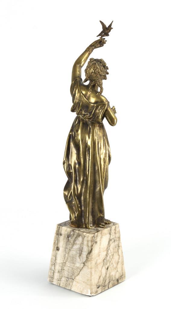 Woman standing in antique-style robe with a bird in her raised hand. Broken solder joint on bird, patina mostly removed, some signs of age/use.