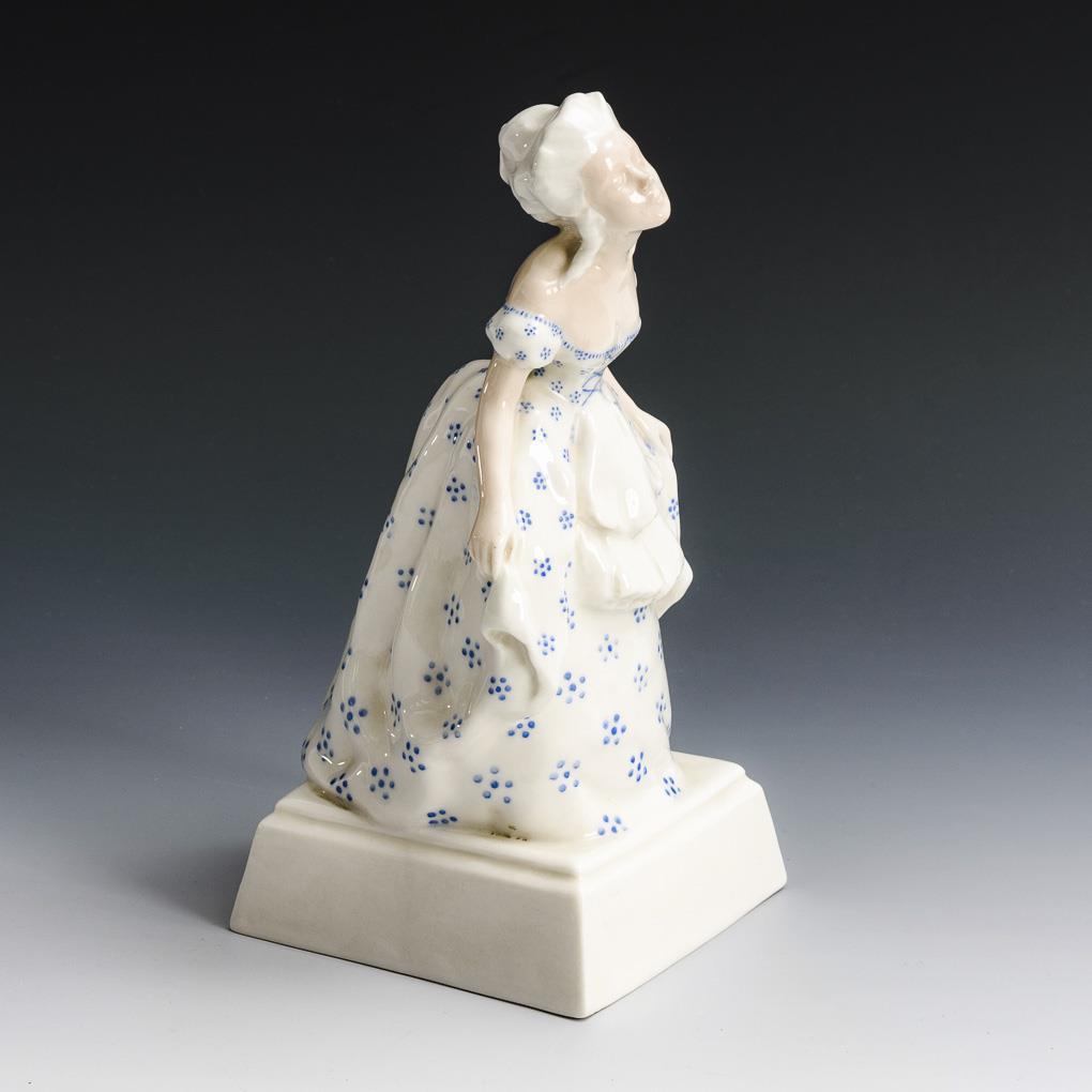 Young woman in flowered rococo dress. Glaze bump at nose tip, minimal bump at one corner of base.