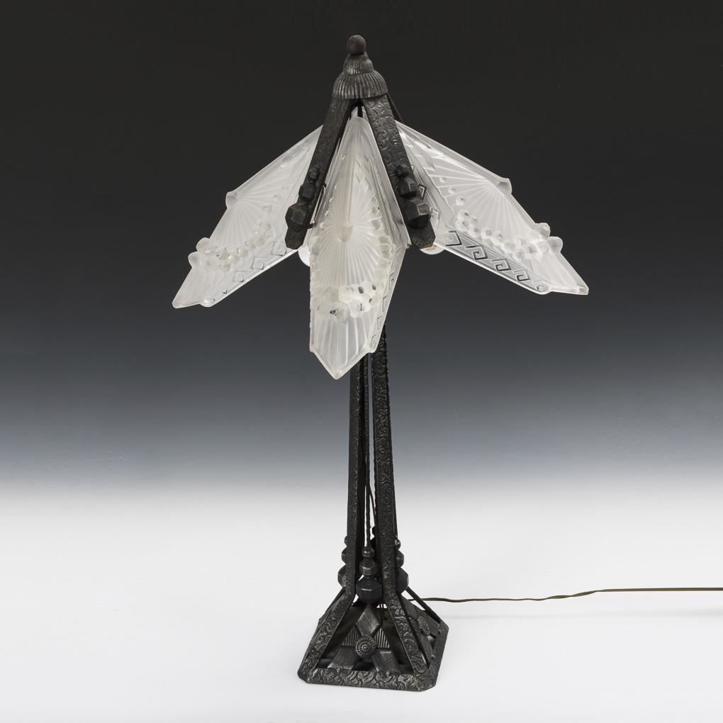 4-light table lamp in the shape of a stylized palm tree, accented with ornaments typical of the style, 4 insertable satin glass shades with geometric patterns. Glass shades with bumps.