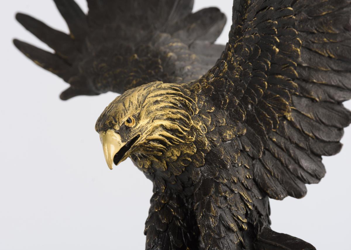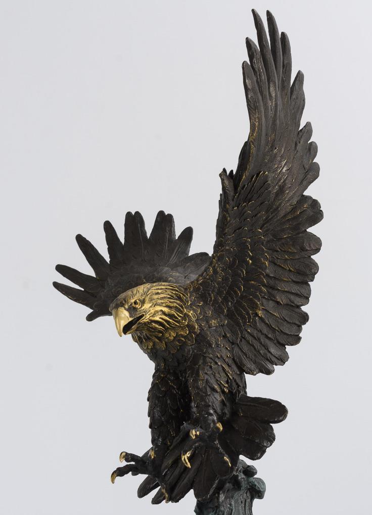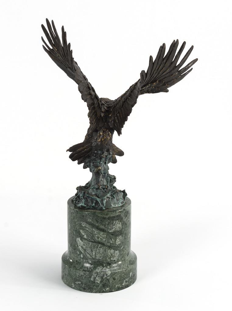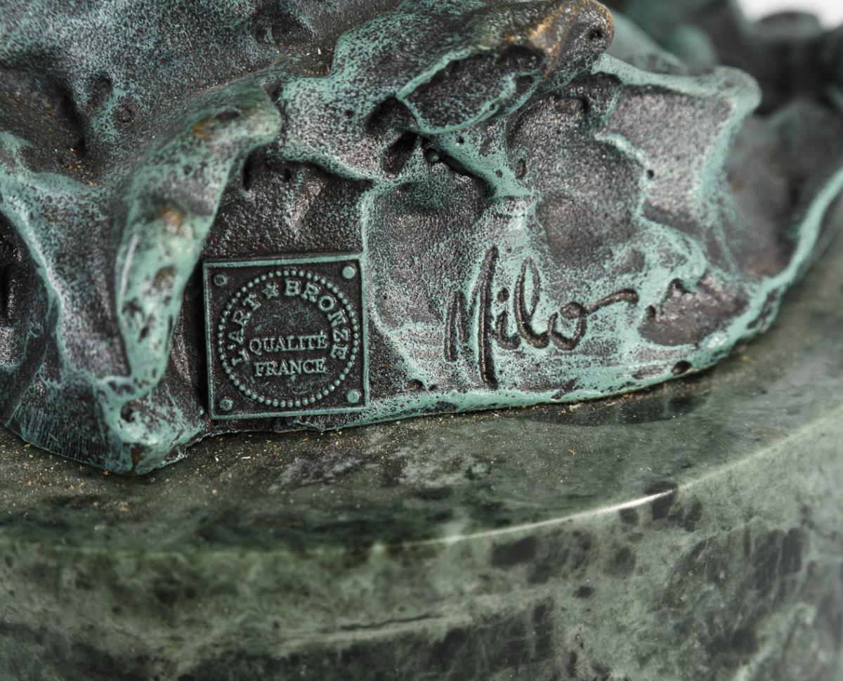 Bronze brown and turquoise patinated / set, partly left gold, green marble base. Inscribed, foundry mark "L'Art Bronze Qualité France". H 33,5 / 48,5 cm. 8.7 kg.