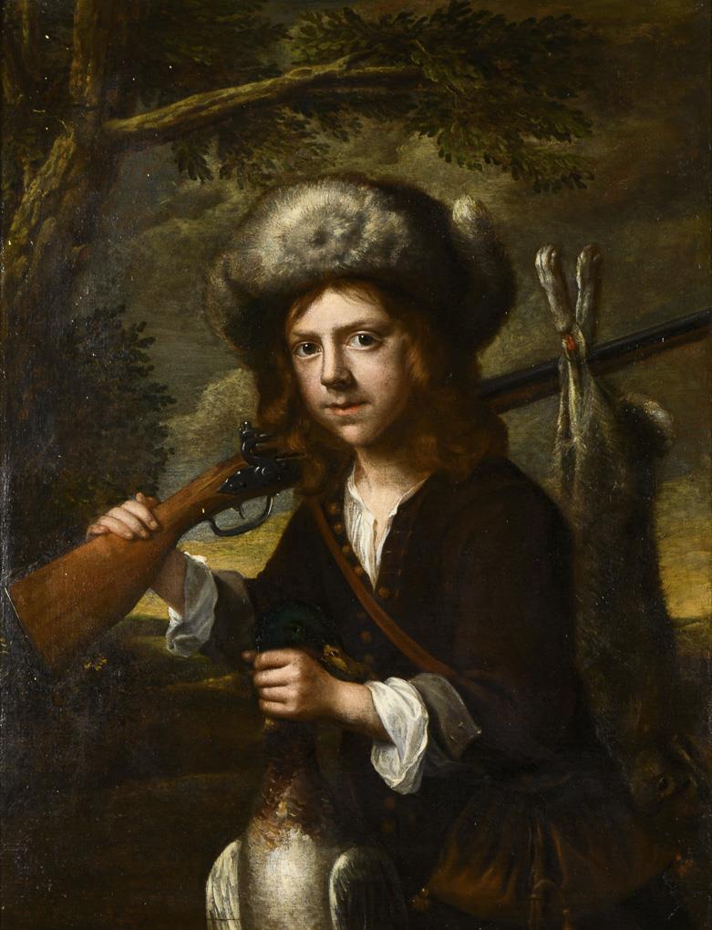 Picture of a young man in hunting regalia with fur cap, shouldered rifle, hare and duck in hilly landscape, which reminds of the painting "The November" of 1643 from the Schleissheim Castle. Canvas old-doubled.
