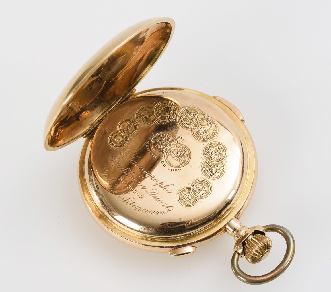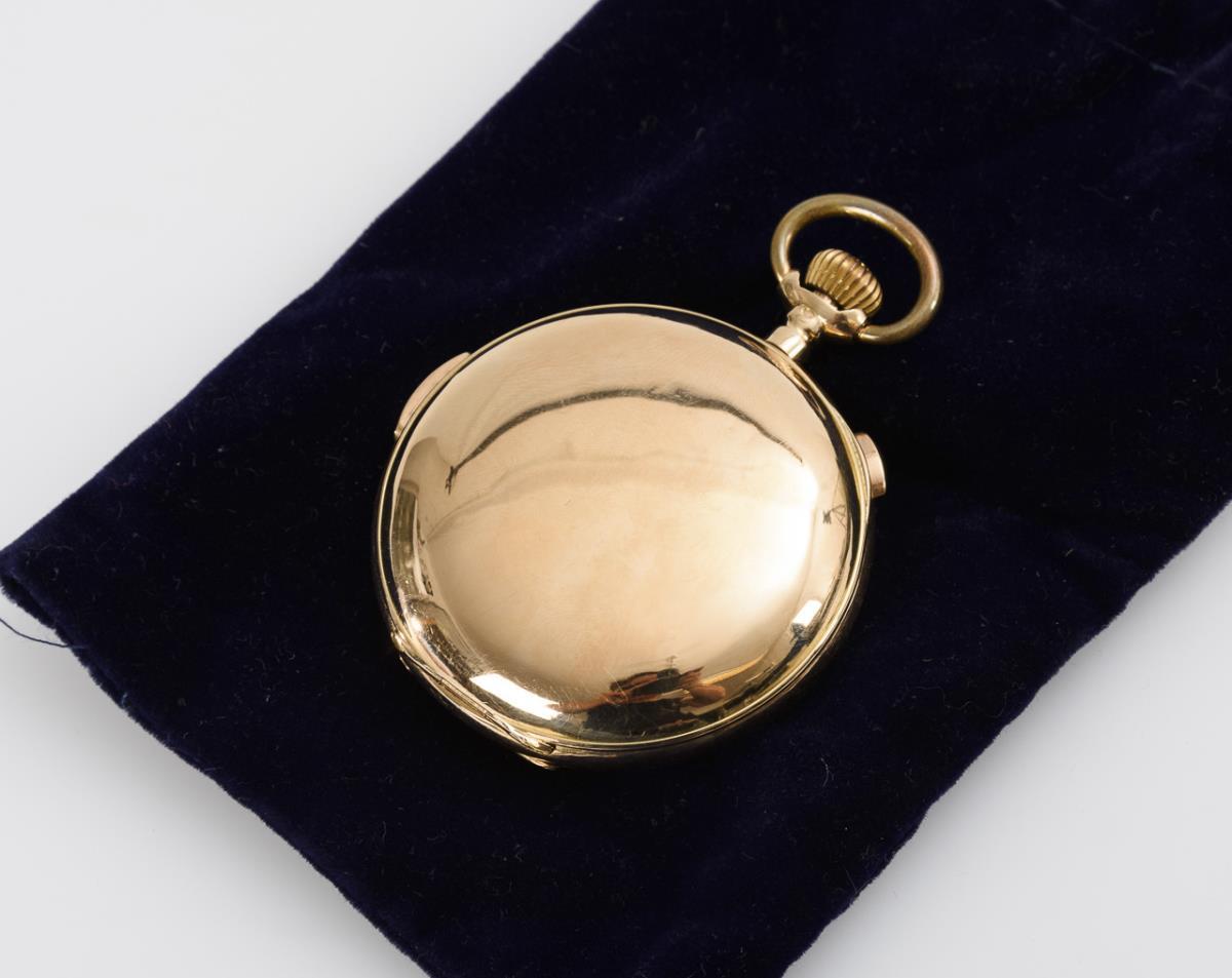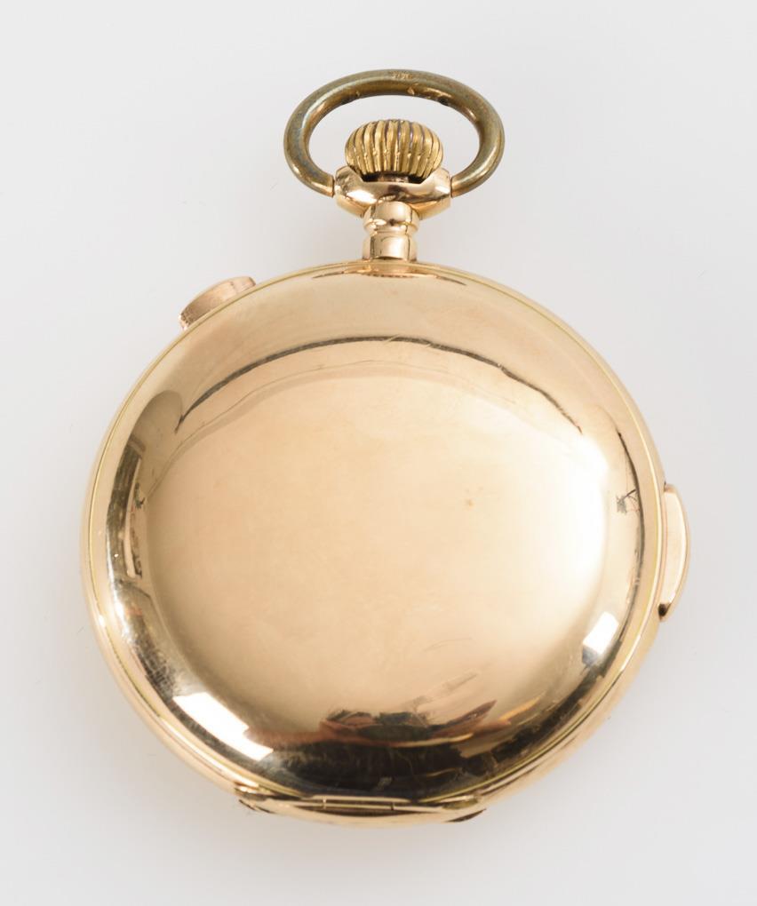 Unmarket movement with Swiss lever escapement, screw compensation balance, blued Breguet hairspring, jewels, crown winding, repeater movement with 2 hammers on 2 tone springs. Movement running, hour/quarter strike in need of revision. White enamel dial with Roman hours and Arabic minutes, minute circle, small seconds and Louis XV hands, center second for stopwatch function with seconds scale and pusher at the 2nd