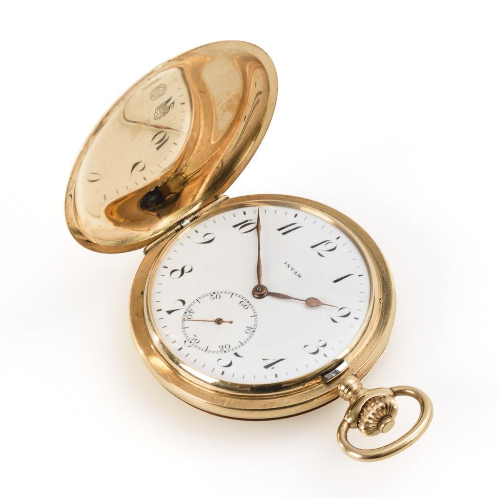 Market movement with Swiss lever escapement, screw compensation balance, blued Breguet hairspring, curved fine regulation, jewels, crown winding. Runs. Marked white enamel dial with recessed leaf center, Arabic numerals, minute crown, small seconds and spade hands.
