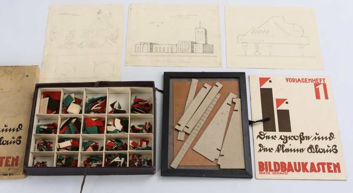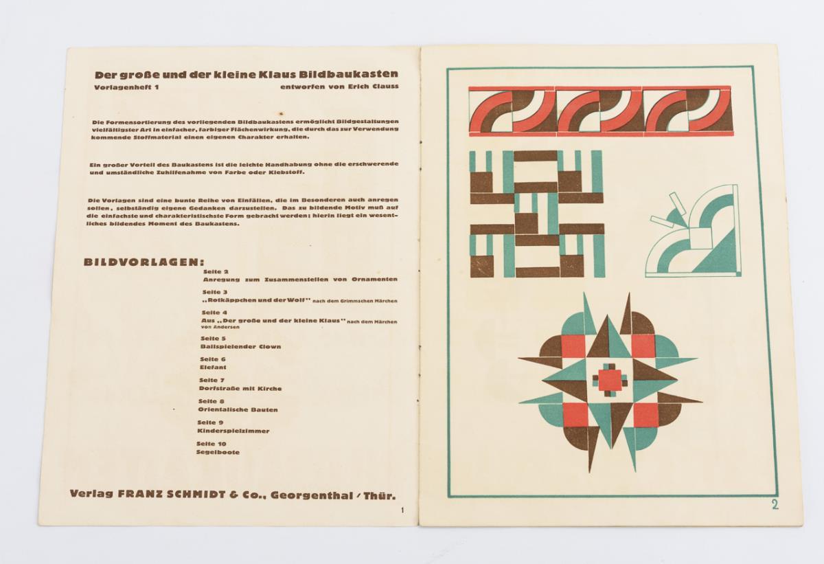 Constructivism and Bauhaus influenced educational game in cardboard box (lid typography by Herbert Bayer). In the lid printed "Instructions for building" and for the use of the utensils. Enclosed "Template booklet 1" in three-color printing with various picture templates (eg ornaments, Rotkäppchen and the wolf, elephant, etc.). In the box 20 fächer with numerous felt pieces punched out in different shapes (in red, green, brown and white). In addition, 3 pencil drawings with further templates in the drawn frame corresponding to the existing picture frame; 1x with color details. Age / use traces on the cardboard.