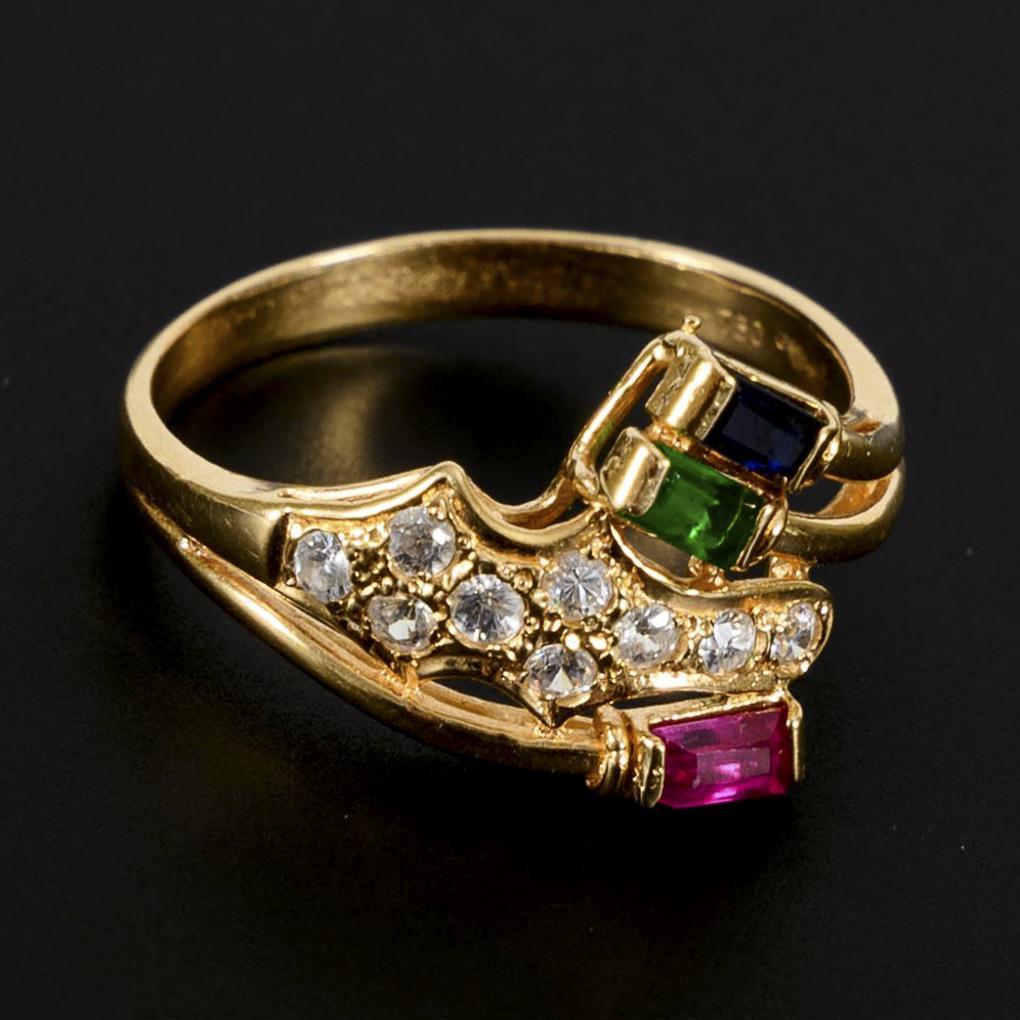 6 small, inset old-cut diamonds, between casket-set sapphire, emerald and ruby. Narrow rail.