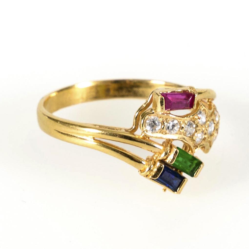 6 small, inset old-cut diamonds, between casket-set sapphire, emerald and ruby. Narrow rail.