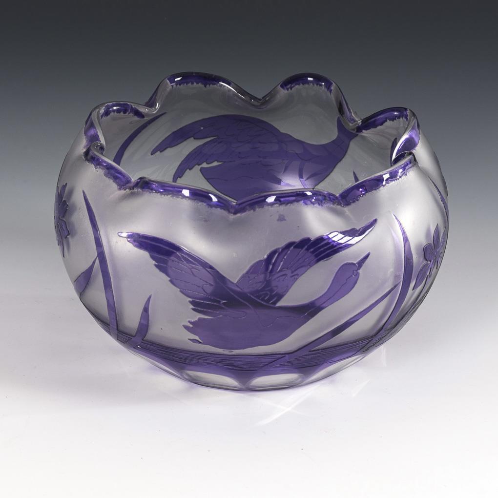 Bulbous vase with a retracted, multiple pinched rim; dislocated cut. Circumferential etched depiction of a strip of water with two geese flying up and water plants. Scratch marks inside.