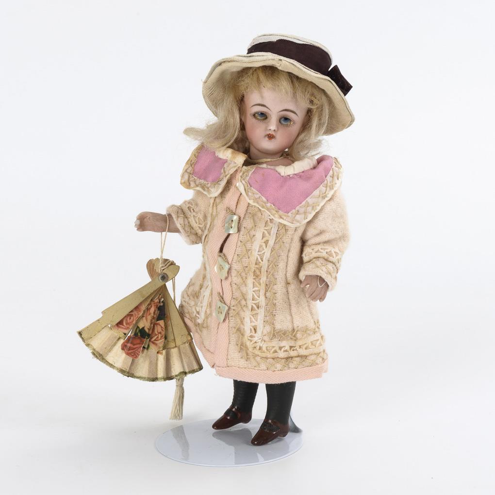 Whole bisque doll with crank head, blue sleeping eyes, blond mohair wig, pink coat, hat and modeled shoes. Head x-rayed: without defects. Right eye cloudy.