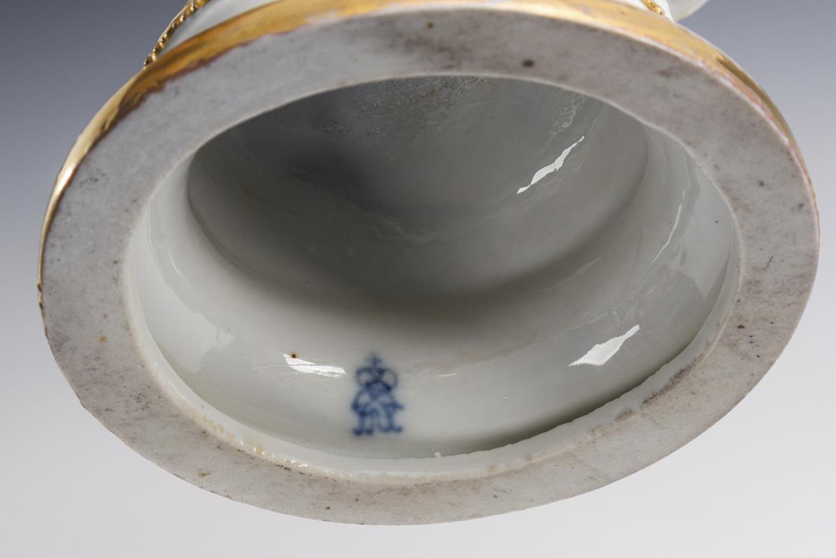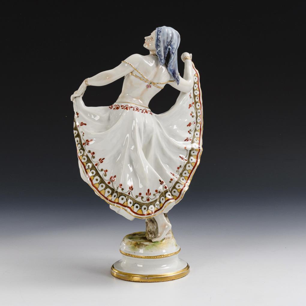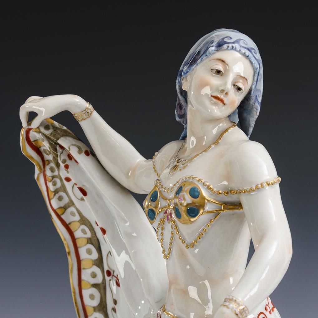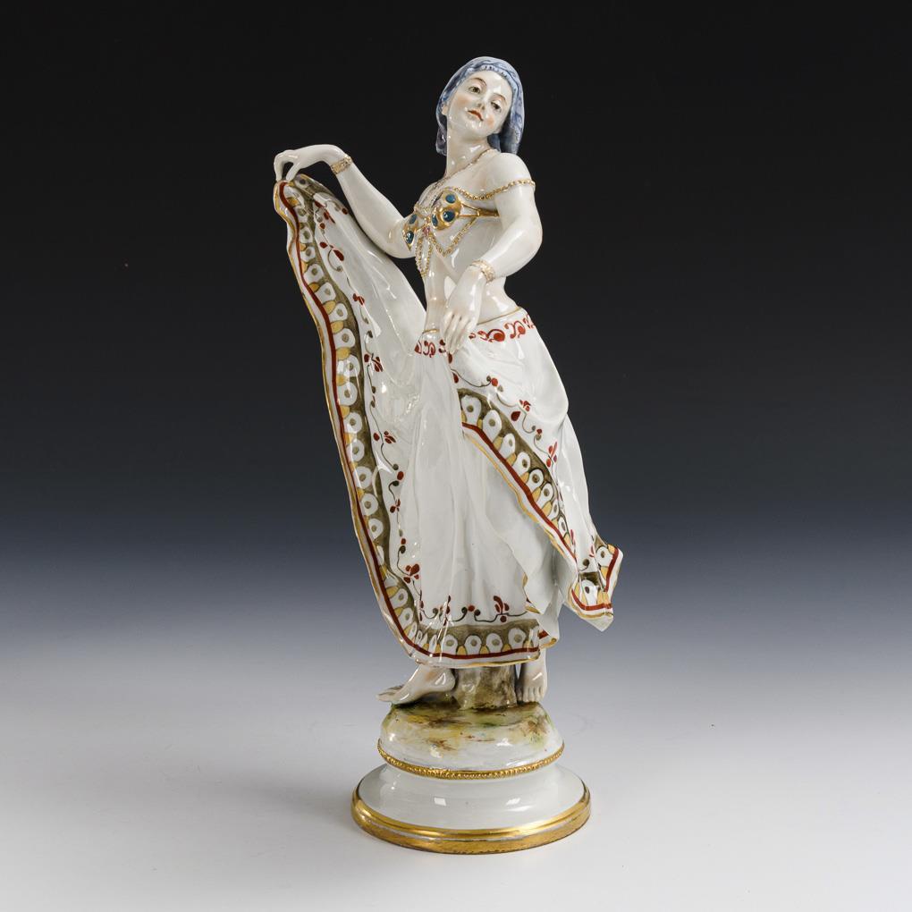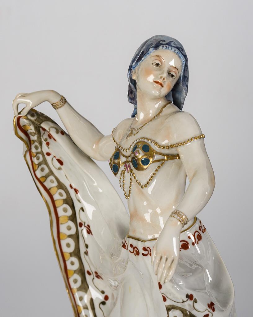 Dancer in oriental dance costume standing on a round base in dance step. Minimal gold abrasion, 4 knocks to the hem of the skirt.