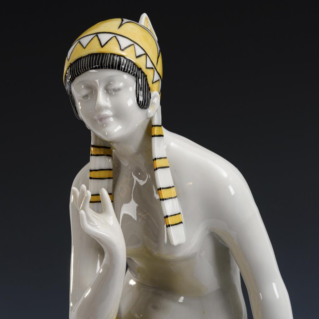 Half nude of a young woman with a yellow scarf standing at a column stump in a dance step. 1 finger minimally bumped.
