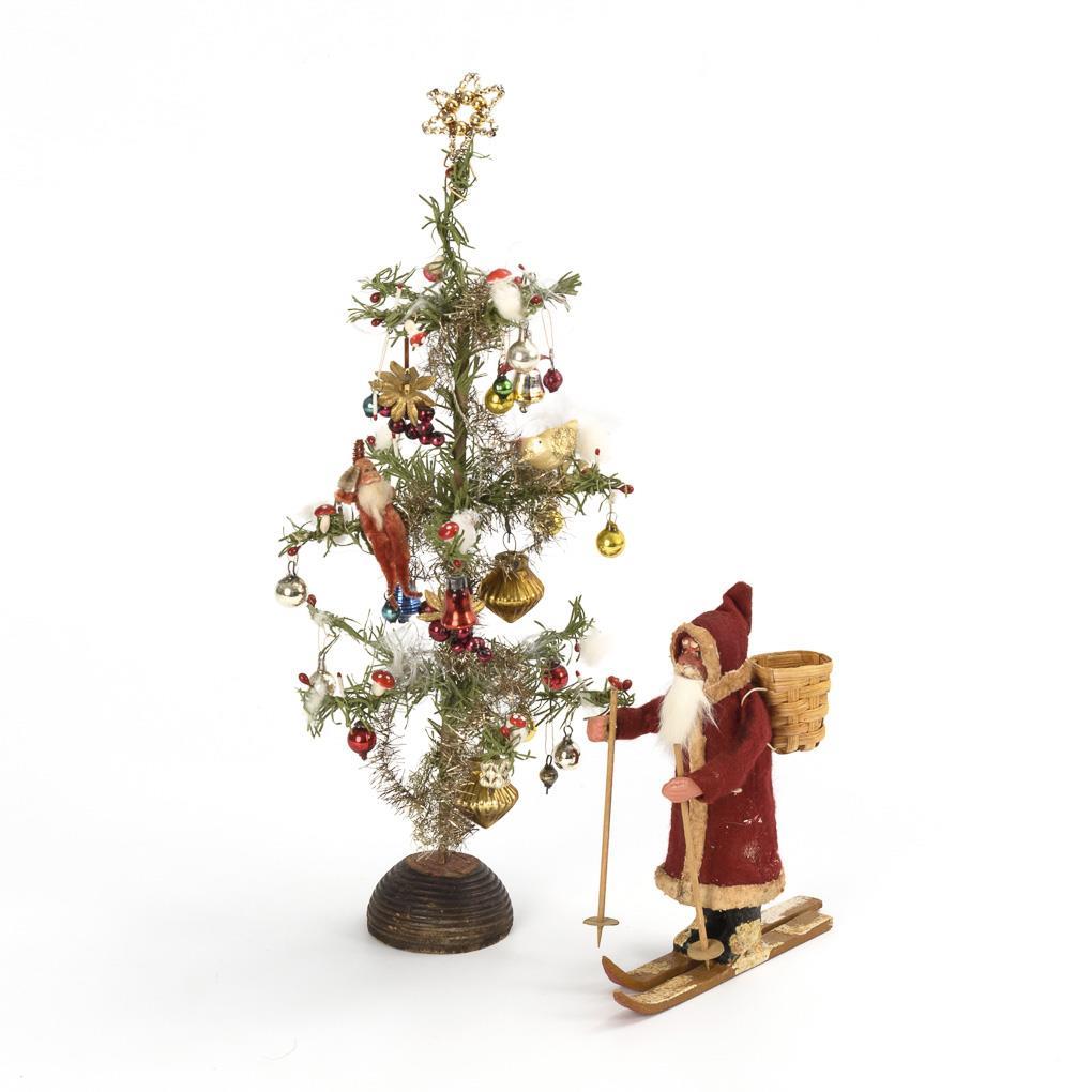 Christmas tree with textile needles, colored glass balls and toadstools made of mass. H 41,5 cm. / Santa Claus as a candy box with red felt coat and pannier. H 18 cm. Small defects.
