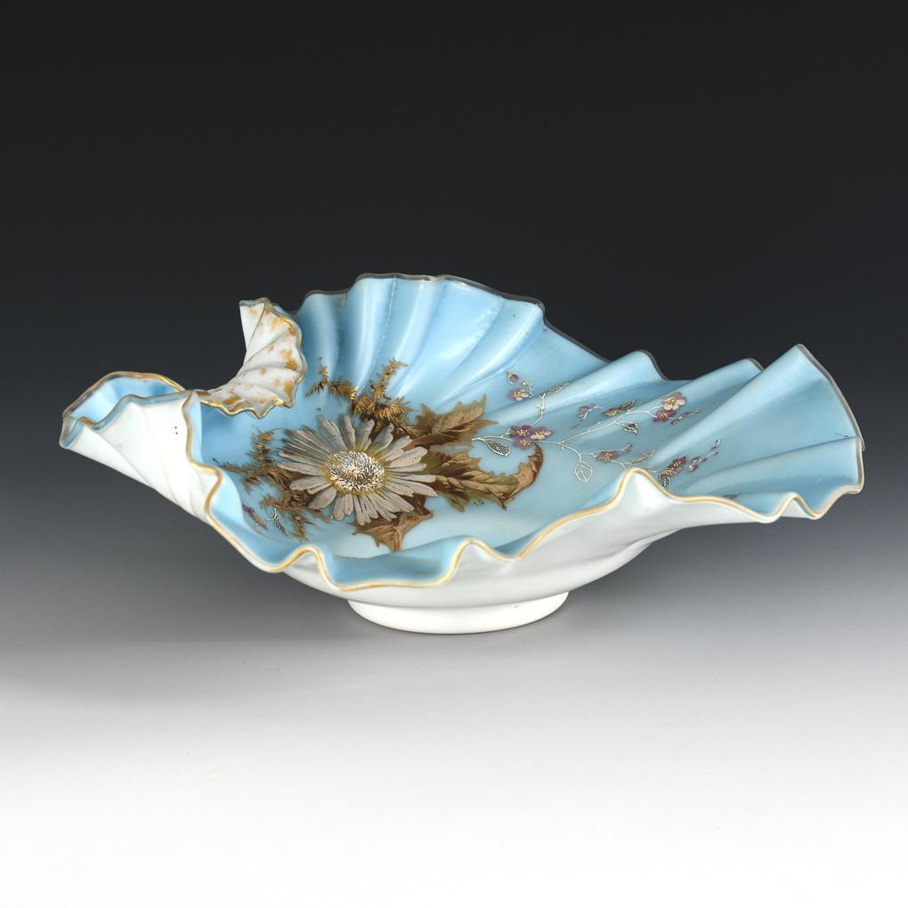 White milk glass with light blue interior and fused, colorless thread on the rim, polychrome enamel painting, gold decoration. Ø 29.5 cm.
