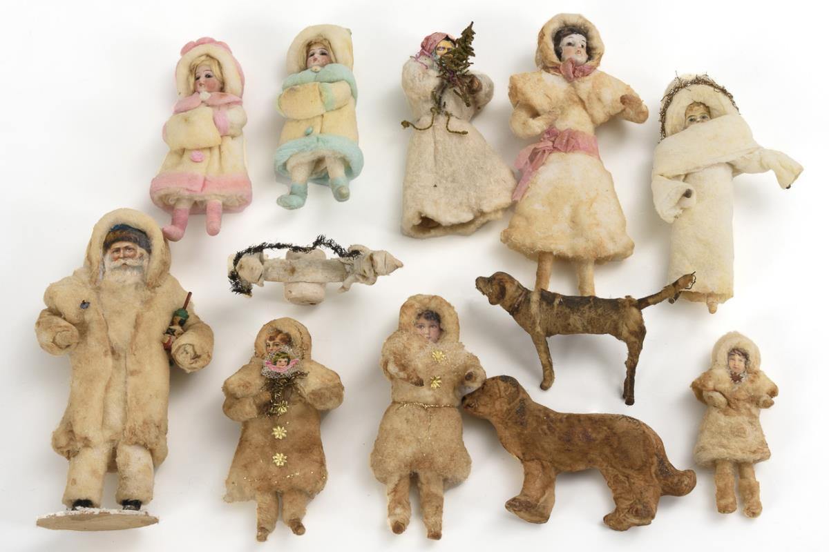 12 parts: Various cotton figures, including 2 as Santa Claus and 4 with porcelain heads. L 11 - 19 cm. / 2 dogs made of cotton wool-like material. H 7/8 cm. Marks of age, small defects.
