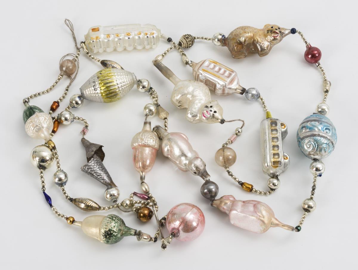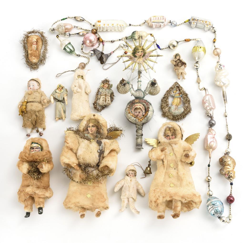 13 parts: Absorbent cotton figurines in various sizes, including 6 with wafer faces and 2 with porcelain heads. L 5,5 - 19 cm. / Tree top with wafers and leonic wires. H 23 cm. / Rare glass necklace with animals, cones and railroad carriages. L 215 cm. / Plus 3 small tree pendants with paper and tinsel, L 5 - 8 cm. Signs of age, defects.