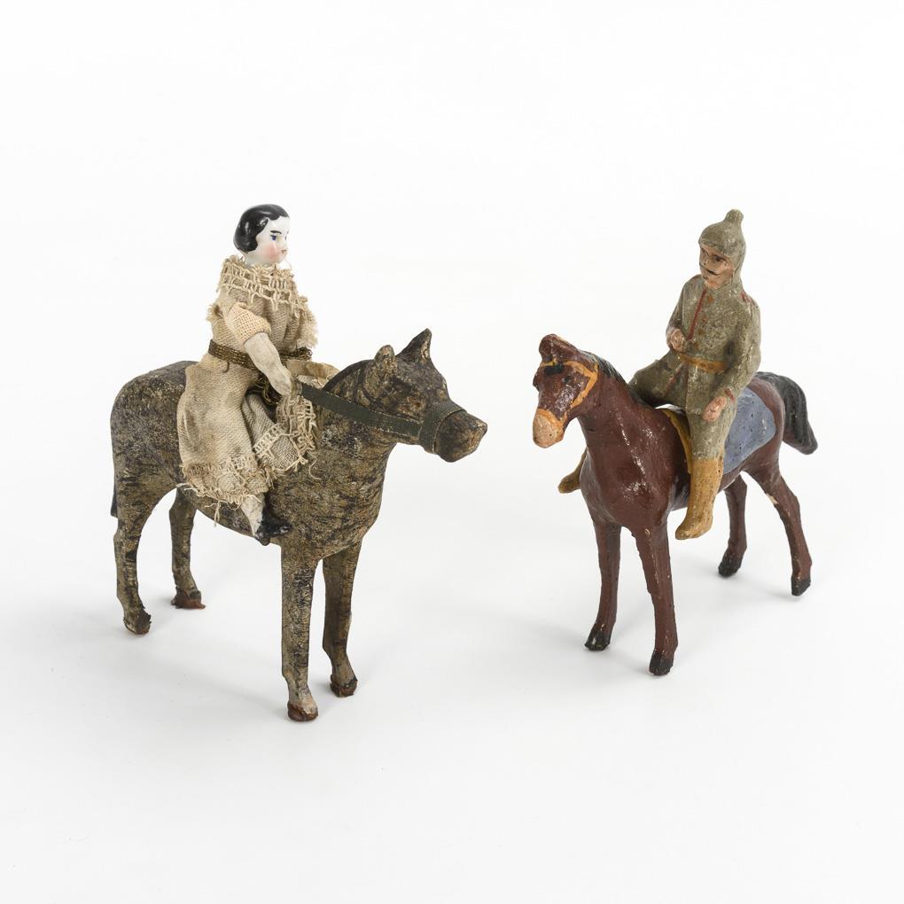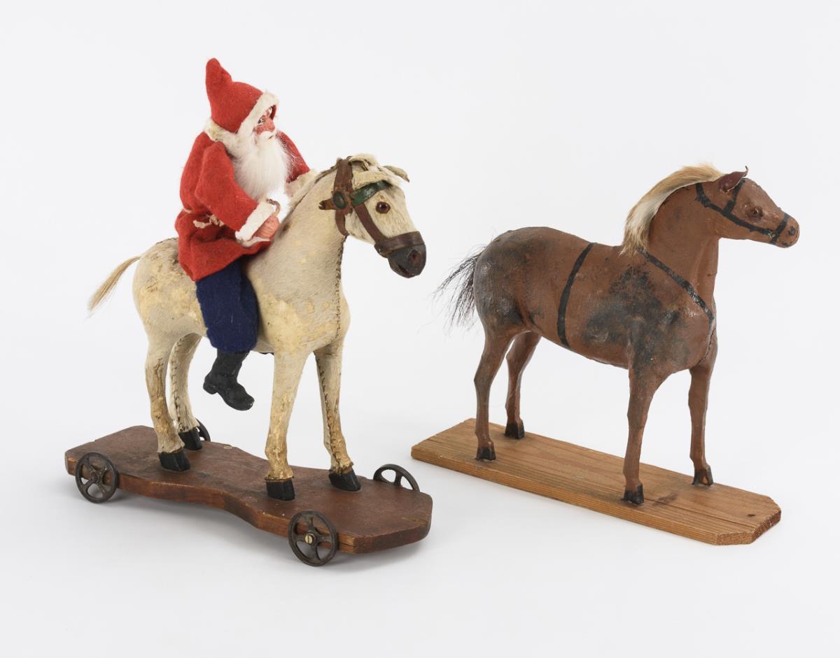 White horse with real hair, on wheel plate. With Santa Claus on horseback. 26 x 23 x 9 cm. / Brown mass horse with human hair mane and tail, on wooden plate without wheels. 20 x 23 x 6.5 cm. / Felt Christmas tree and candle spout, on leaf-shaped base with mica. H 26 cm. / 2 small mass horses, 1x with riding soldier, 1x with chest head puppet. H 11,5 cm. Marks of age and defects.