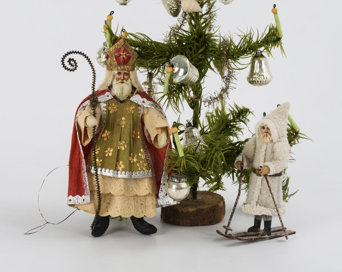 Christmas tree with glass ornaments and tinsel chain. H 40 cm. / Wire figure with red mantle of crepe paper, wafer face, miter and crozier. With hanging as tree ornament. L 17 cm. / Santa Claus dressed in white on skis. L 11.5 cm. Signs of age, 2 parts defective glass ornaments loose enclosed.