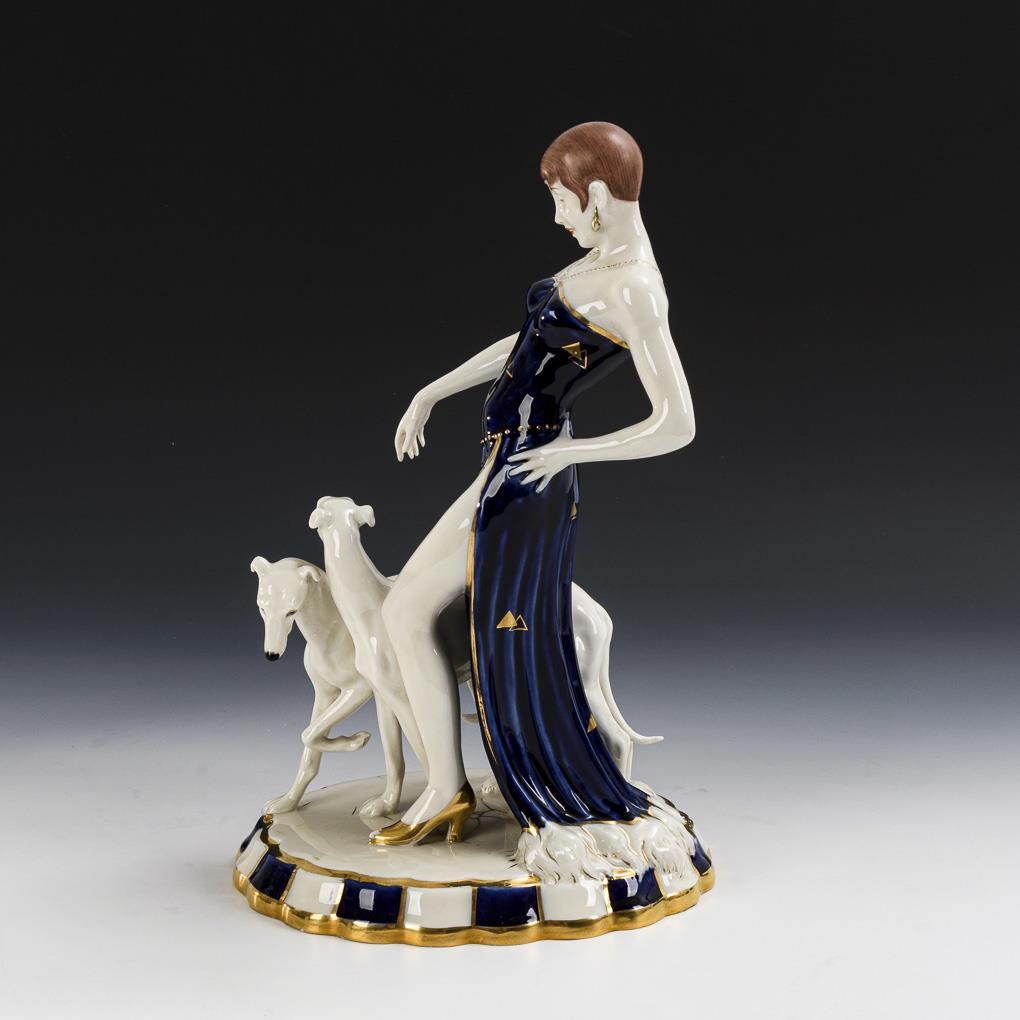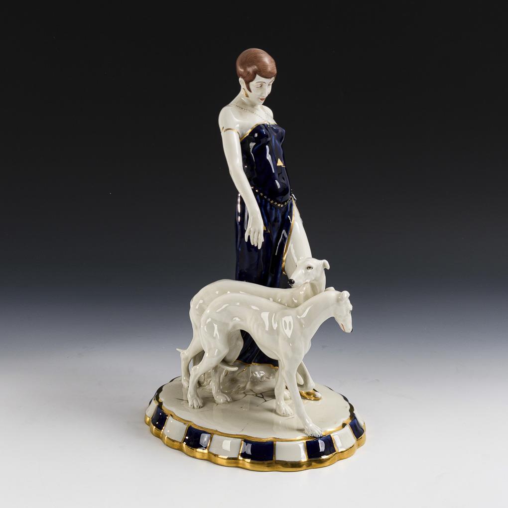 Art deco group of a young lady with two greyhounds. Minimal gold abrasion.