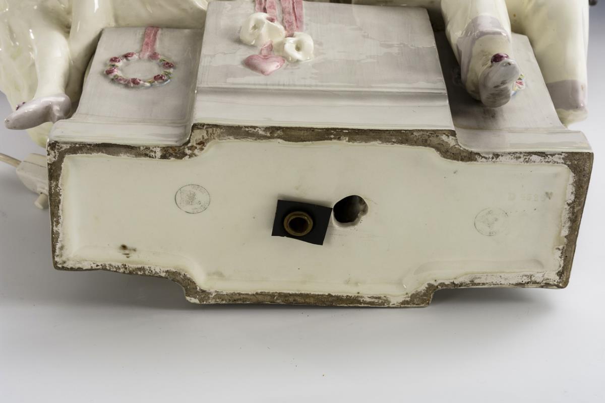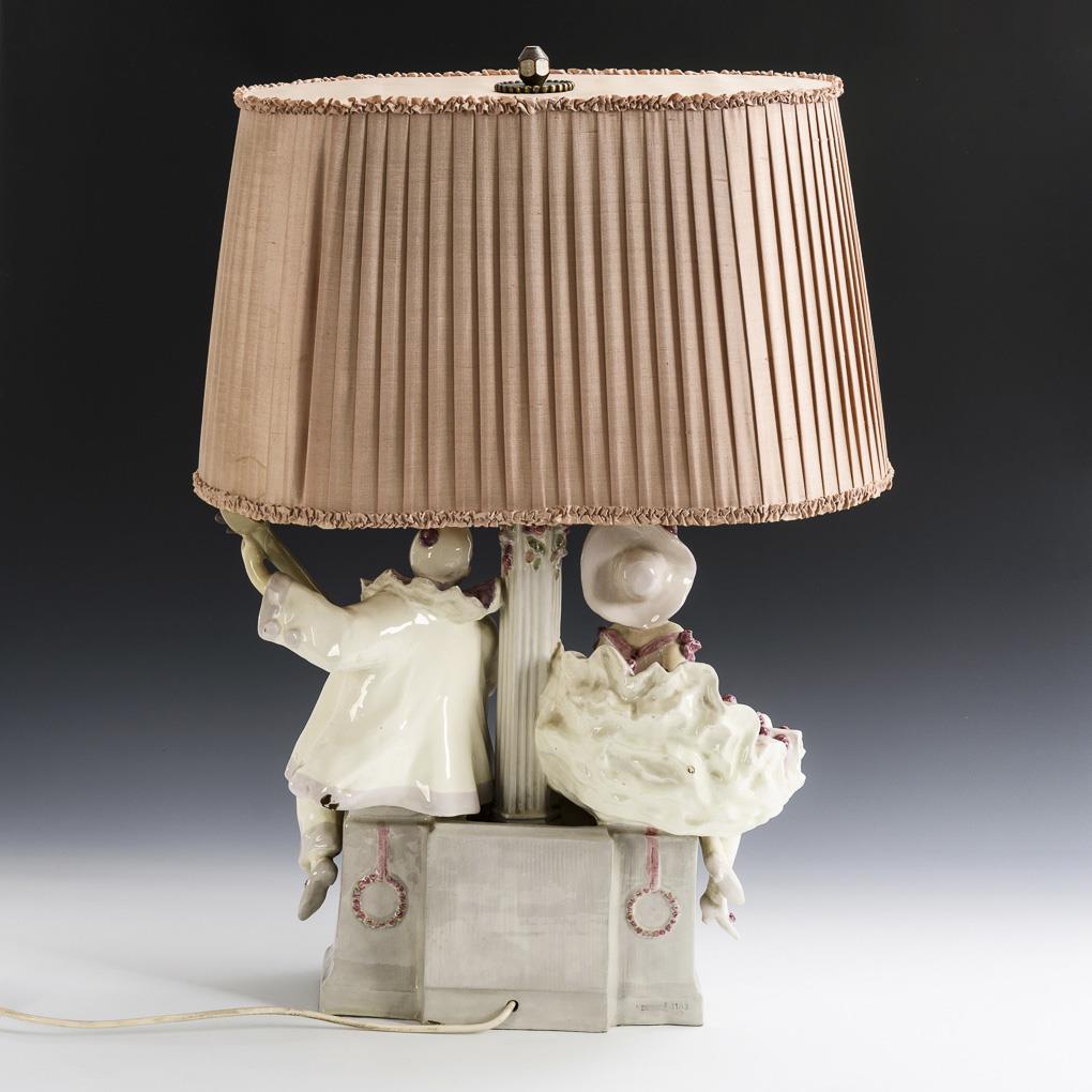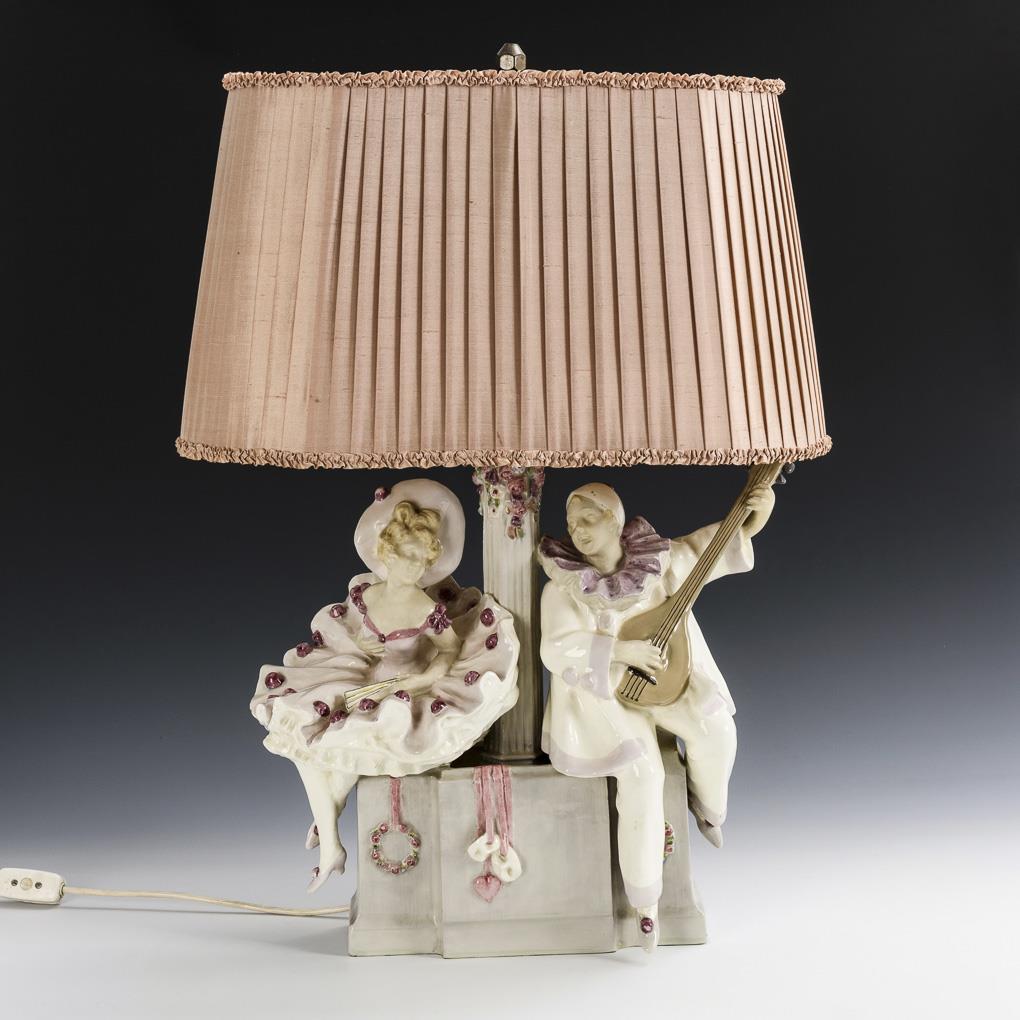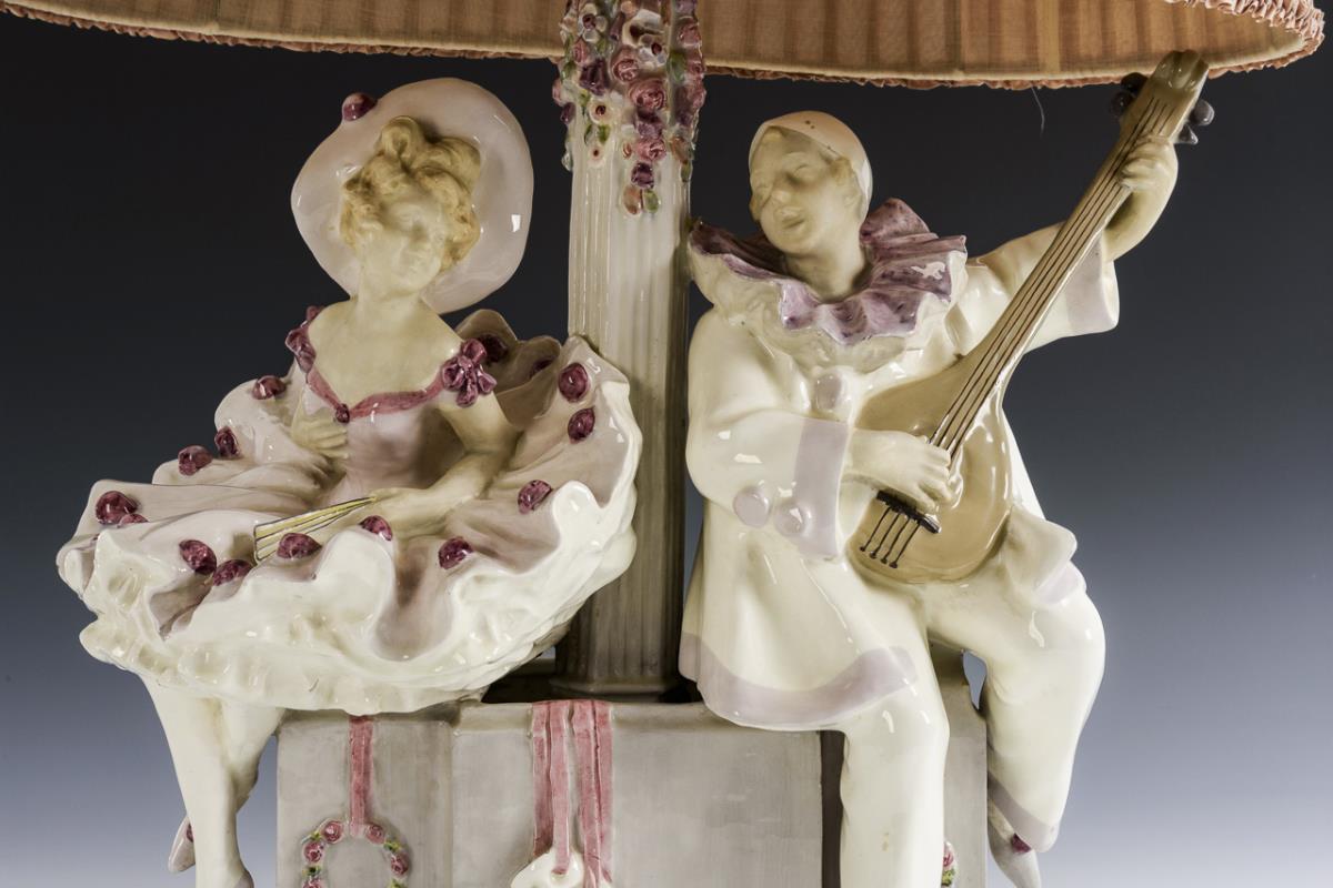 Fountain-like lamp base with flower-decorated column shaft and a lute-playing Pierrot and cheerful Colombine. Oval shade with rosé fabric cover and pleated fold. Double lamp holder. Electrified, function not tested. Lute and left hand of Pierrot restored, mount unstable / in need of revision.