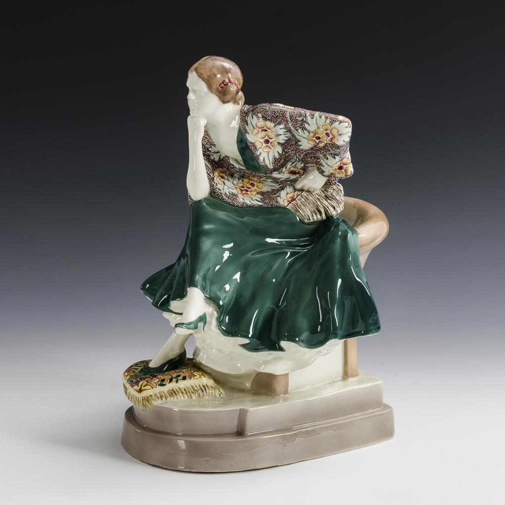 Sitting lady in green dress with flowered stole and foot cushion, on stepped oval base. Right foot, restored at the skirt hem and base corner.