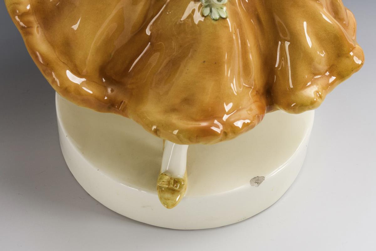 Dancing girl in ocher yellow dress, on round base. base, nose tip, frilled sleeves slightly bumped.