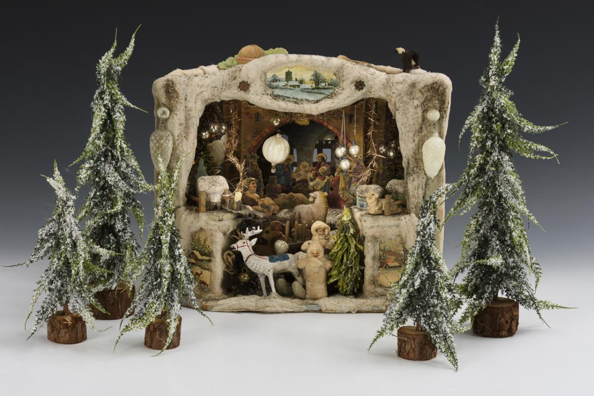 Winter designed case with absorbent cotton decoration and mica, equipped with glass ornaments, absorbent cotton figures, little trees and cardboard nativity scene attached to the back. Work plays "O du fröhliche". 25 x 31.5 x 25 cm. / 2 large and 3 smaller fir trees with mica. H 18/30 cm. Marks of age, small defects.