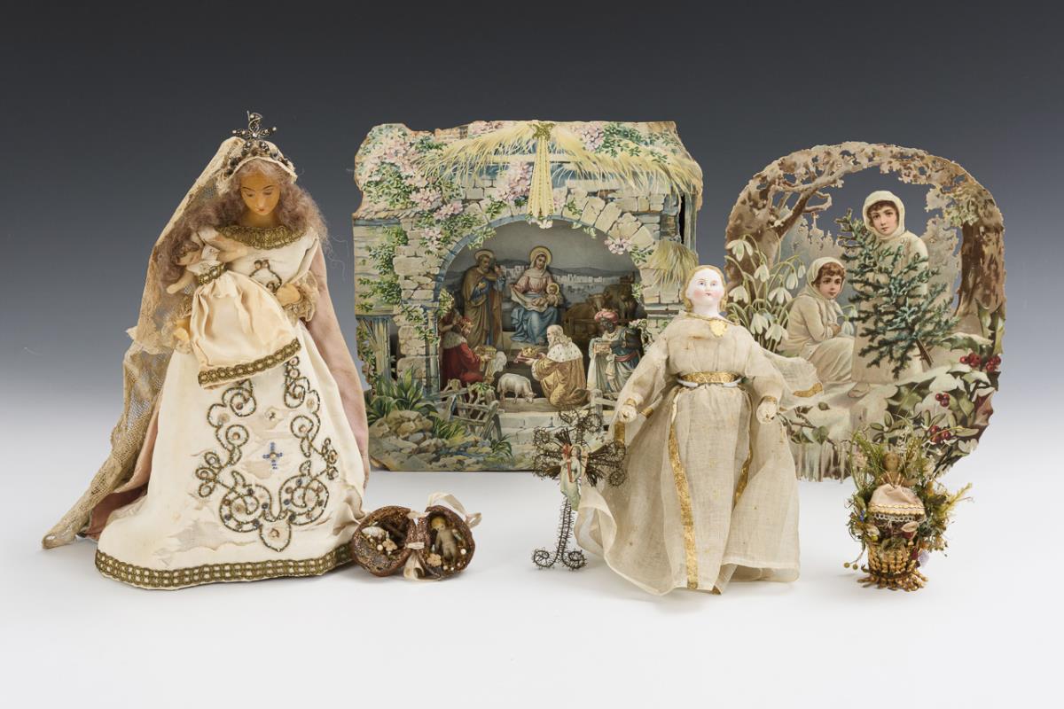 7 parts: Mary with Christ Child: heads and hands each made of wax. H 30 cm. / Angel with bisque chest head and light dress with gold trim. Without legs. H 22 cm. / Christmas crib made of colored lithographed cardboard. French newsprint from 1916 on the back. 25,5 x 24 x 6,5 cm./ Embossed cardboard picture with 2 children in the snow. 24 x 19.5 cm. Plus 3 small parts (wax child in nutshell, basket with wax child and wire cross with wafer. Traces of age, some small defects, Madonna with younger weighted foot.