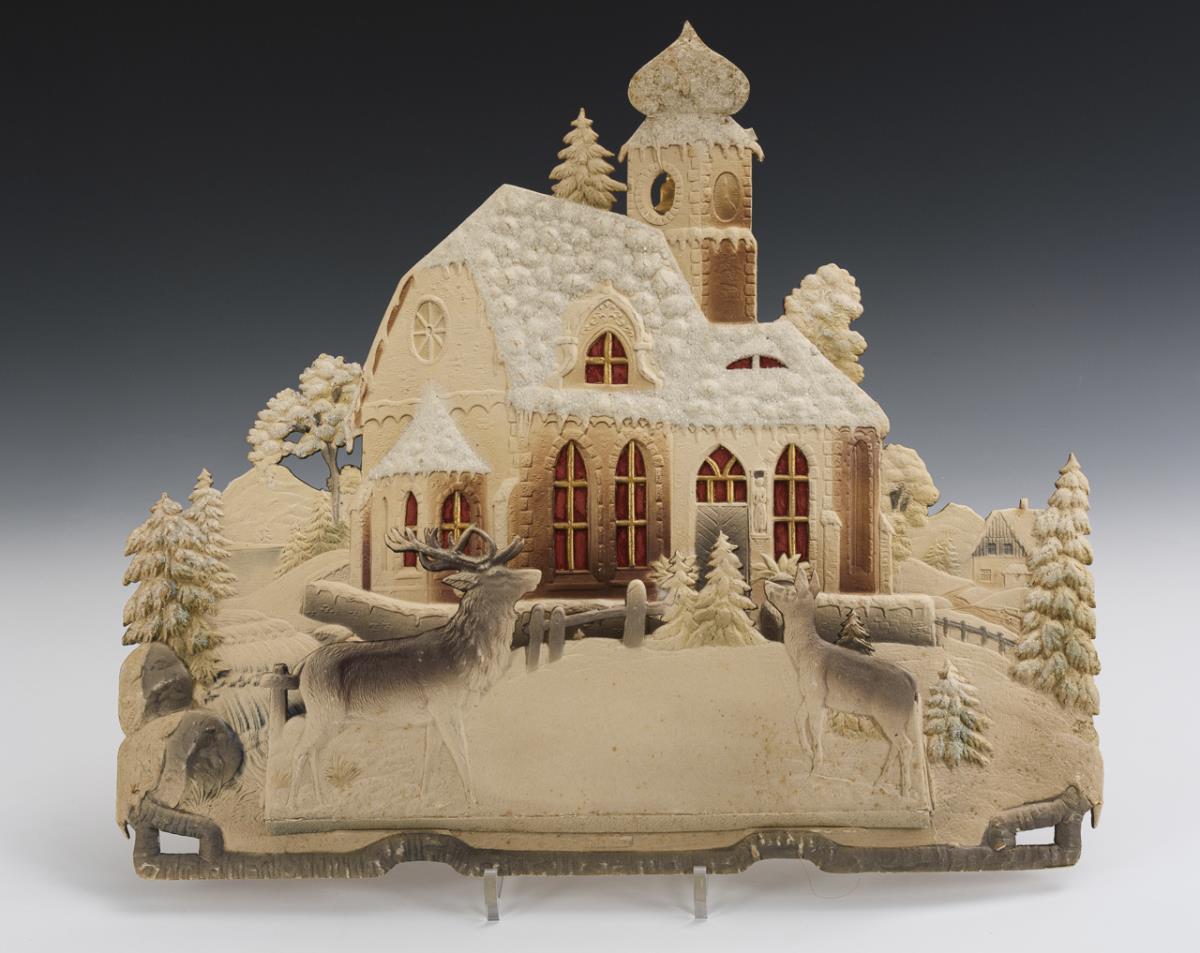 Cardboard church with snow mica on the roof, 43 x 48.5 cm. / Santa Claus with tree, gift bag and animals, on mudflat base. 23 x 27 x 24 cm./ 3 toadstools made of absorbent cotton and mass. H each 11 cm. Marks of age, small defects.