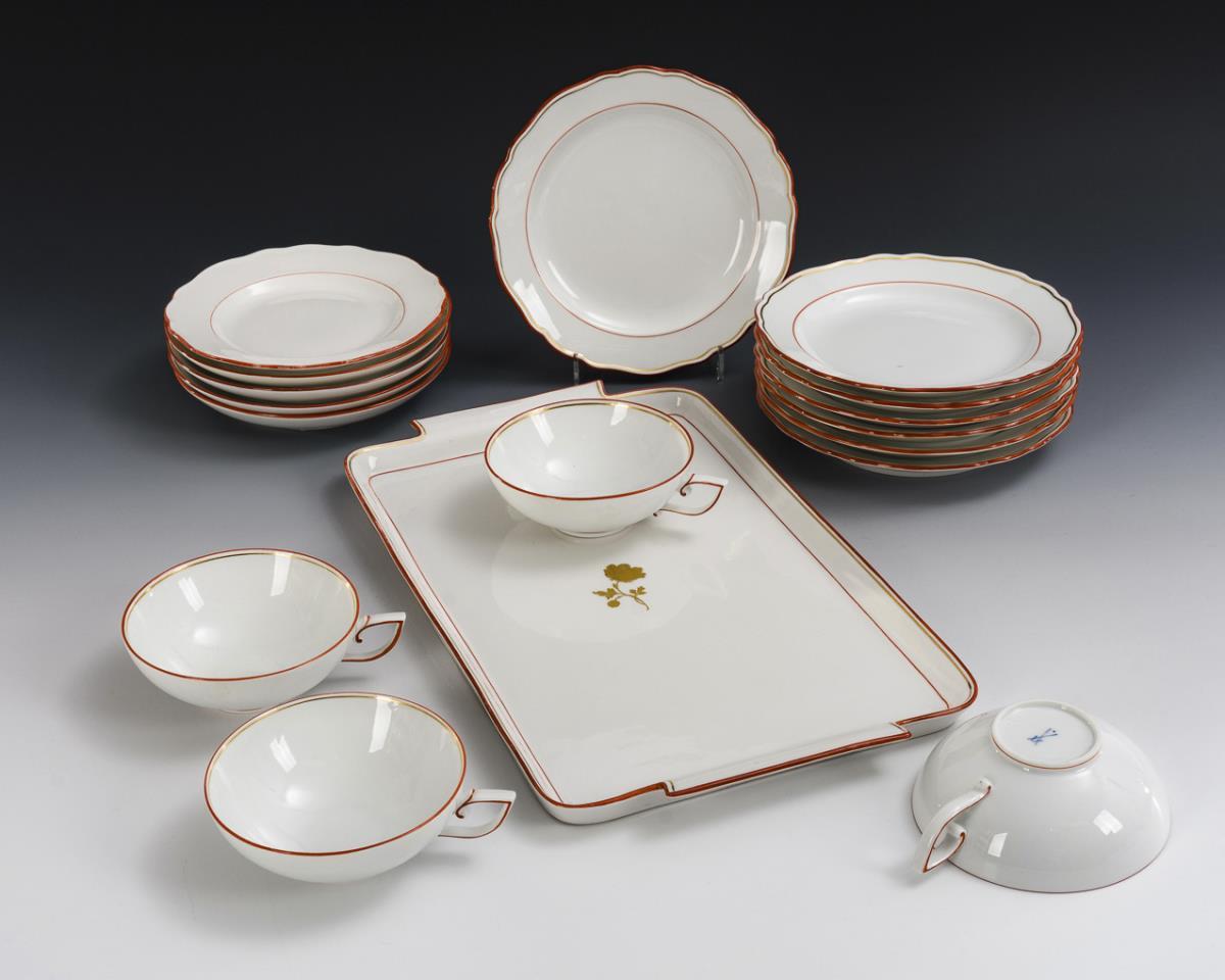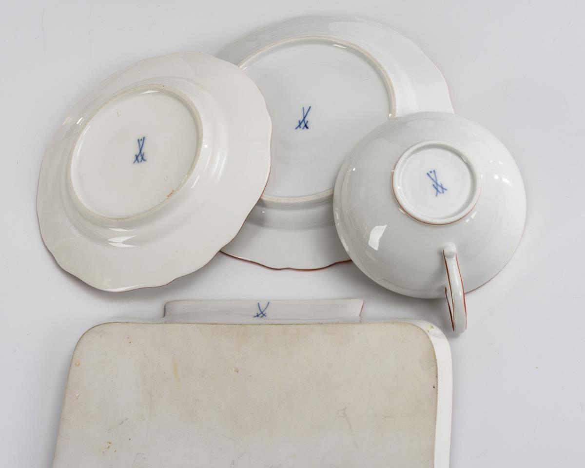 17 pieces coral rim porcelain. Meissen.