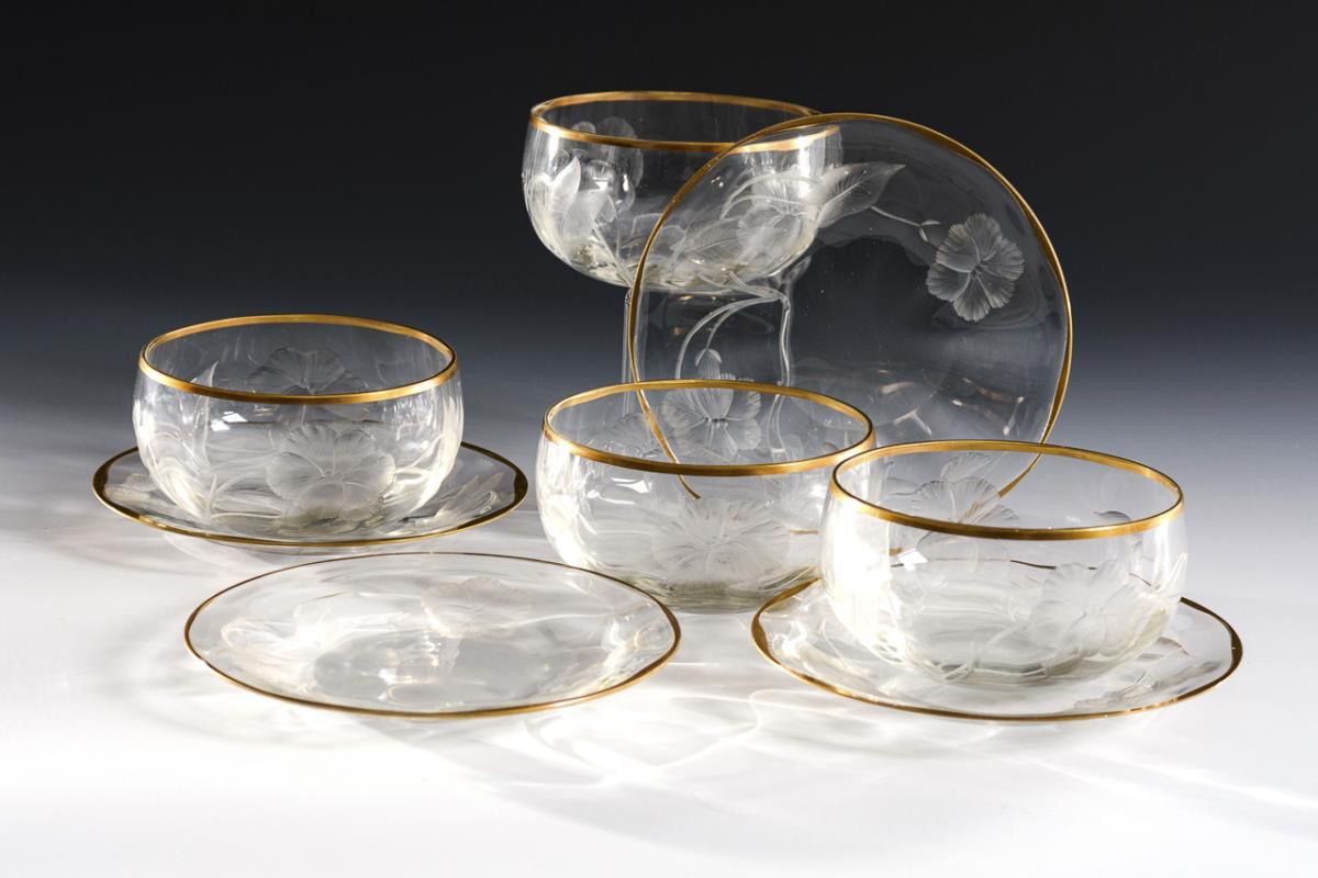 Colorless glass, gold decoration. 4 bowls (h 6 cm), 4 saucers (Ø 15.5 cm).