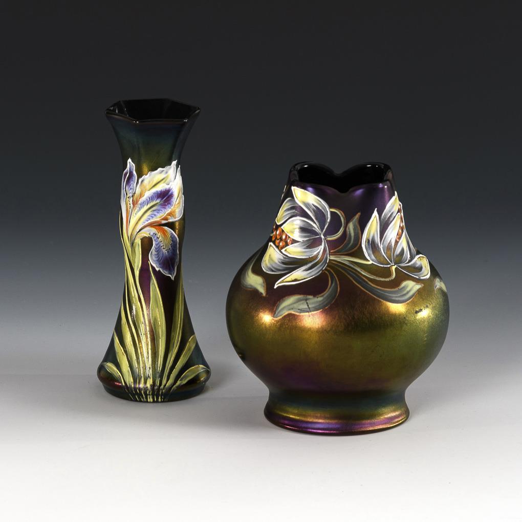1x numbered "140 p. 65": small slender vase with six-pass rim and an enamel-painted iris flower / 1x numbered "167 II p. 108": bulbous vase with four-pass rim and floral enamel painting.