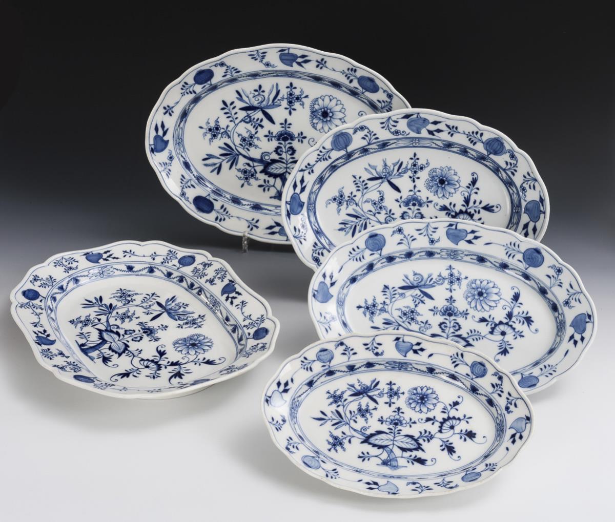 Painted underglaze blue. 4 oval plates (L 28, 34, 35 and 40 cm), 1 rectangular plate (28.5 x 39 cm).