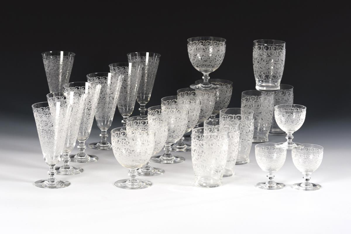 Wraparound ornamental etched decoration. 7 champagne goblets (h 14.5 cm), 6 tumblers (h 10.5 cm), 7 goblets (h 10.5 cm) and 3 liqueur glasses (h 7.5 cm).