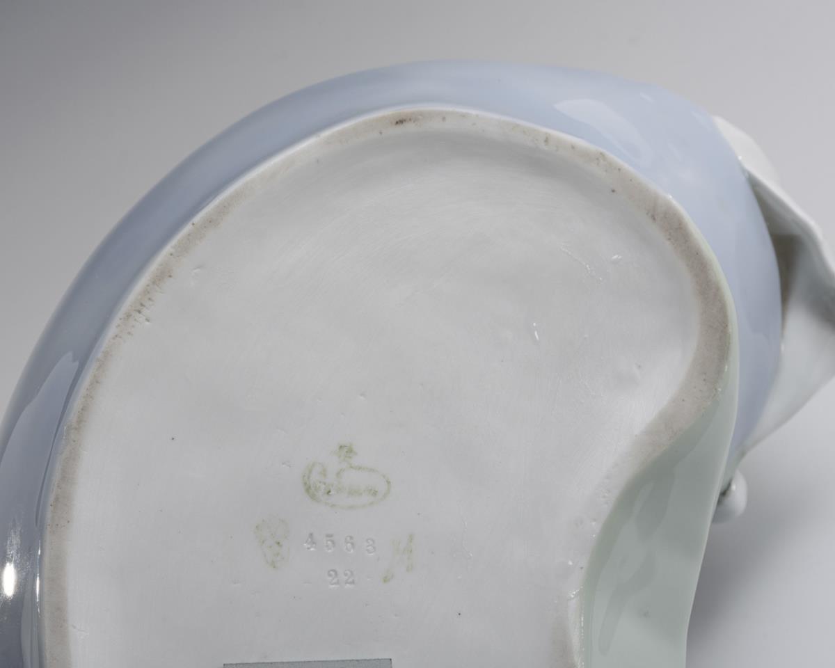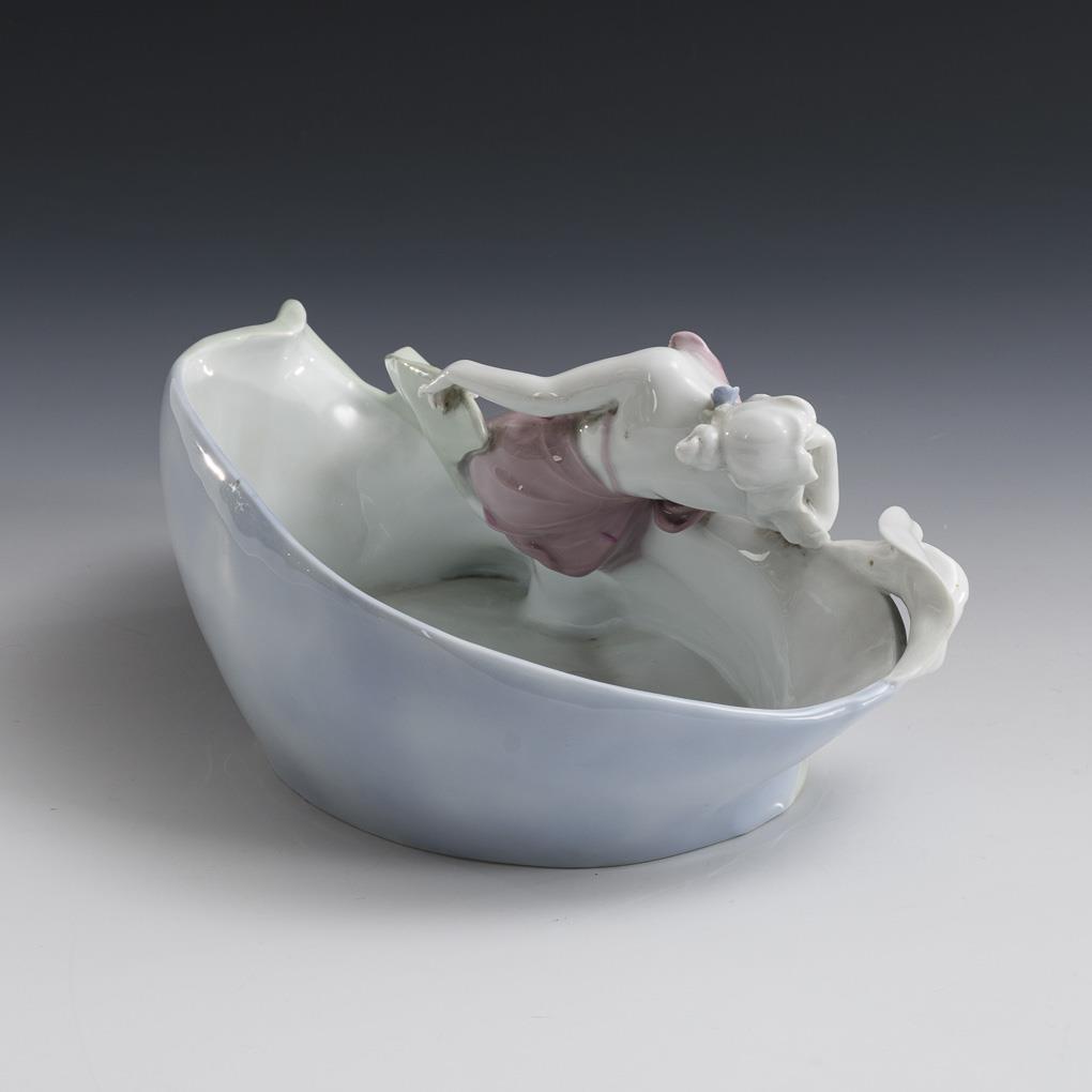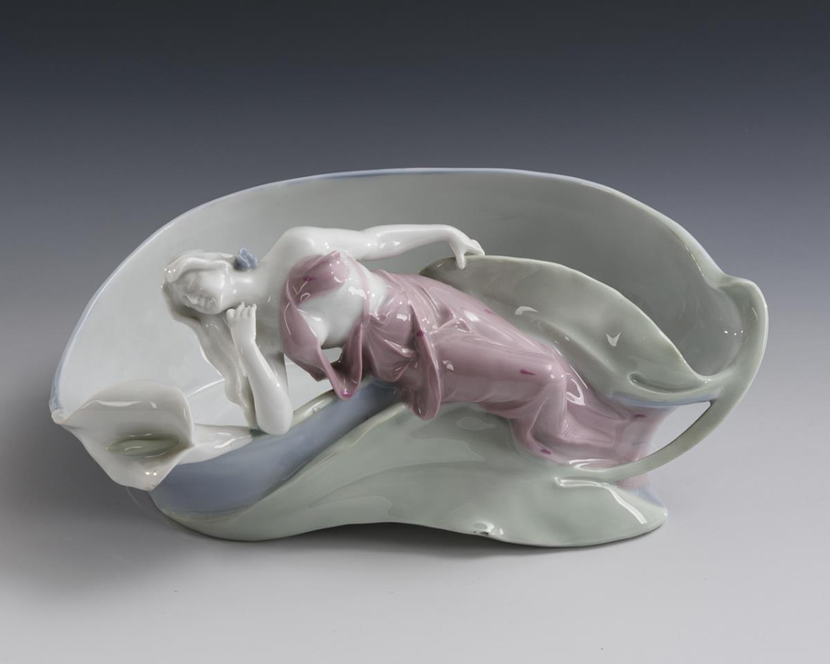 Crescent-shaped bowl with a woman lying on the rim. Small chip to 1 flower rim.