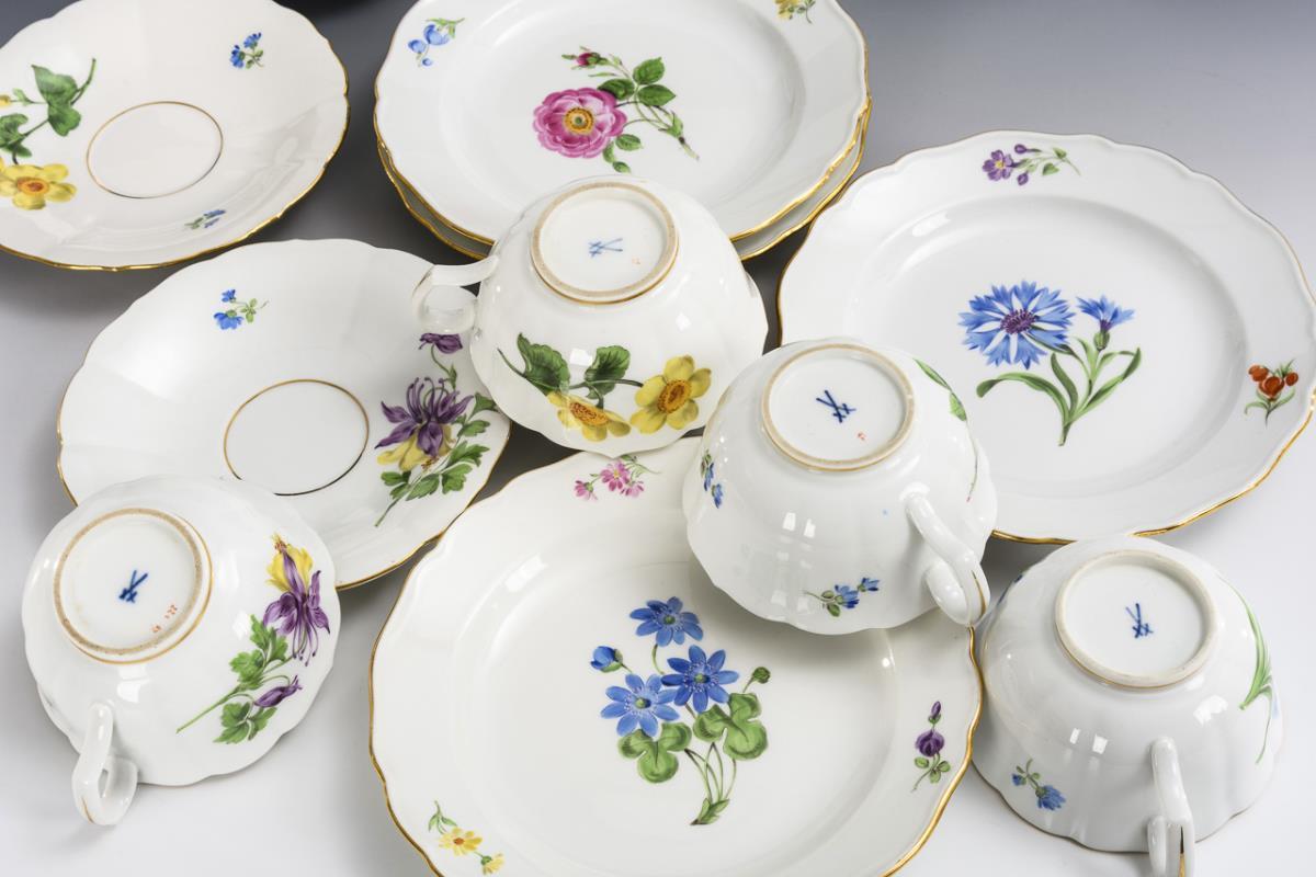 Polychrome flower painting, gold decoration. 4 teacups (H 5 cm), 6 saucers (Ø 15 cm), 6 cake plates (Ø 18 cm).
