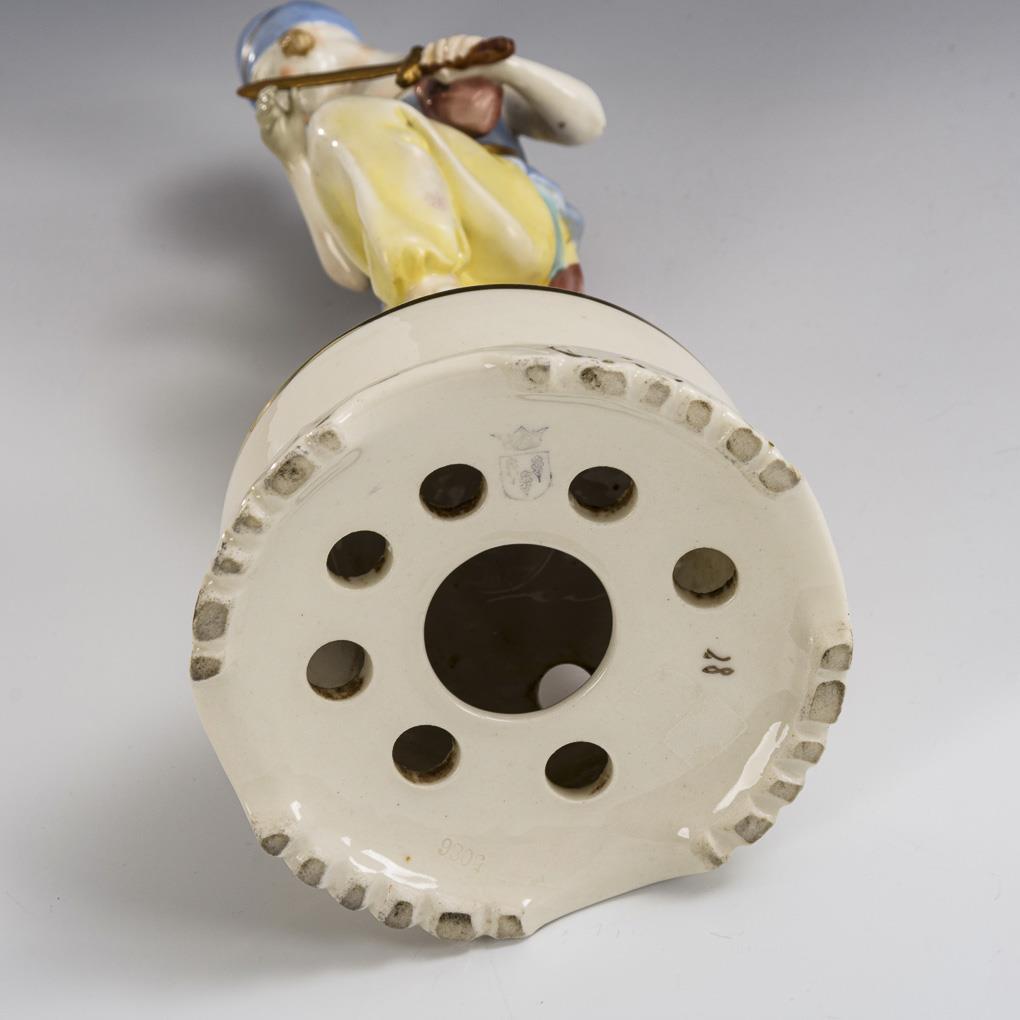 Dancer with sword standing on an openwork round base. Sword and right hand restored, partial glaze craquelure, gold rubbed, 1 blossom missing.