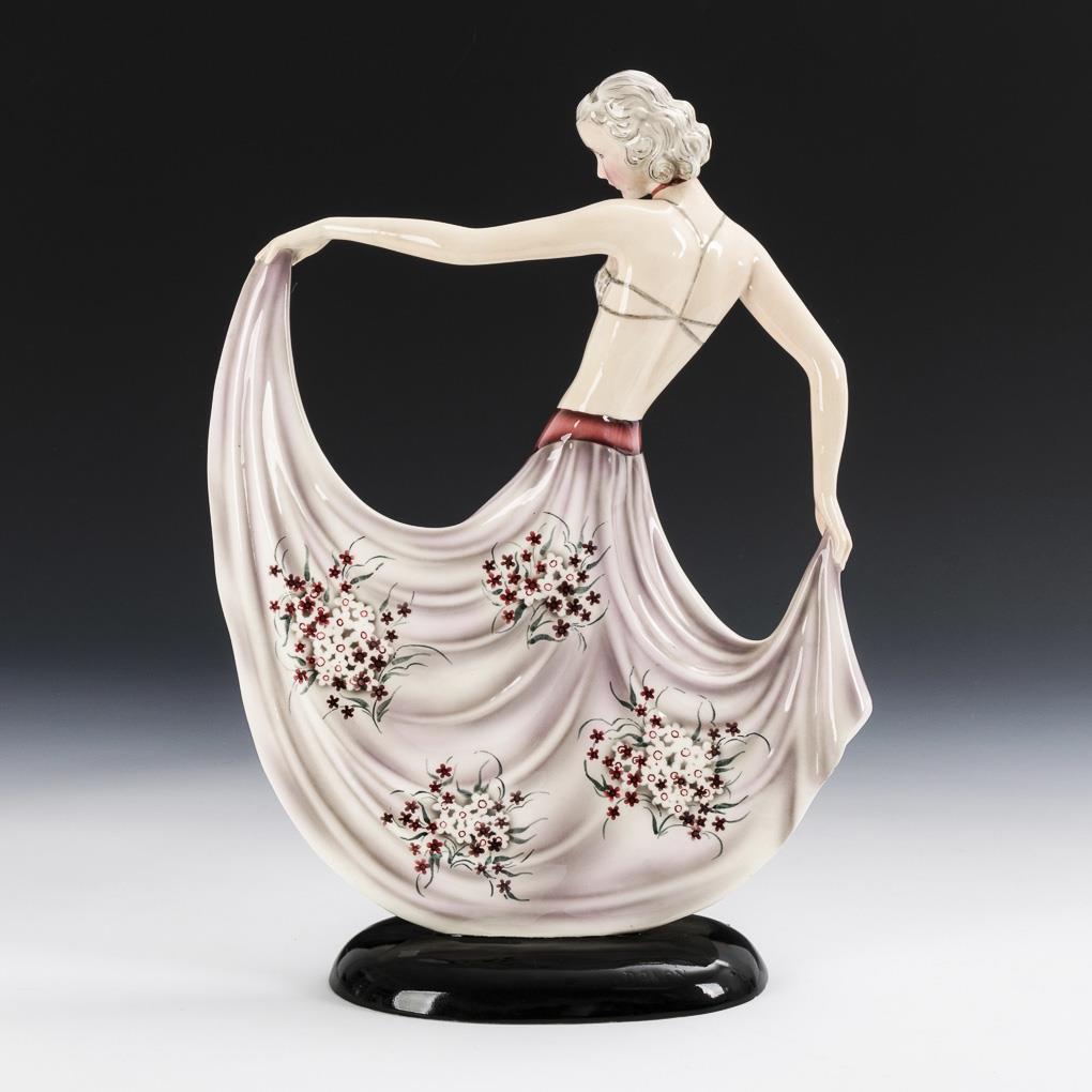 Dancer with bikini and skirt held to dance with floral pattern, on black oval base. The model for this figure was probably the actress Lida Baarova (real name Ludmilla Babkova, 1914-2000), who became famous in Germany for her film "Barcarole" (1935) and for a love affair with Joseph Goebbels. Because of the latter, she was expelled back to Czechoslovakia by Adolf Hitler in 1938. Although Baarova had dark hair, the manufactory designed the figure with light hair, as this seemed more in line with the "German taste of the time". Probably retouched burn crack on the neck, right ankle with fine crack, left shoe with glaze crack, left finger with small glaze chip.