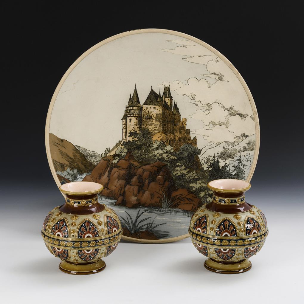 Large Wilhelminian style wall plate with castle view and a pair of Wilhelminian style relief vases. Villeroy & Boch.