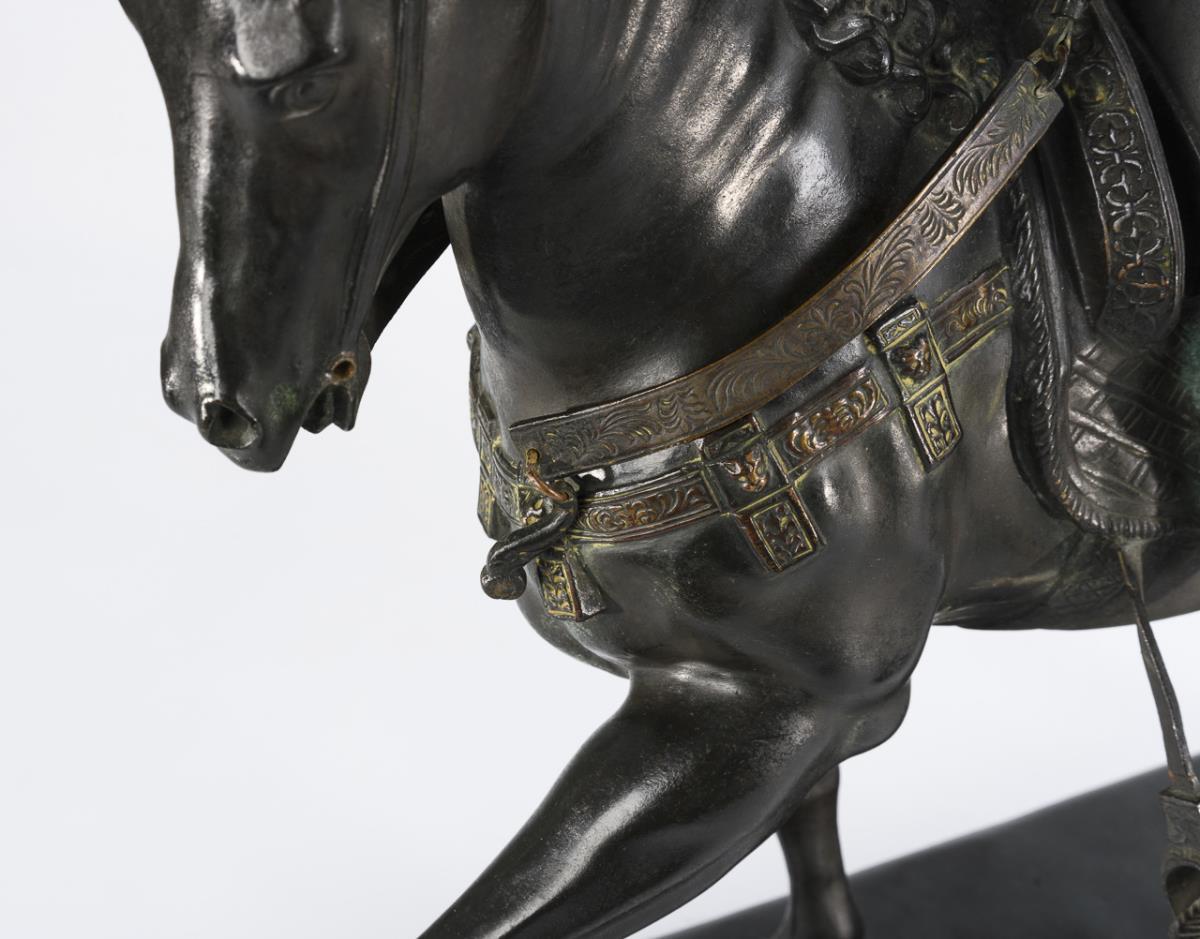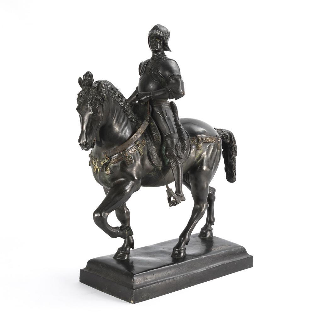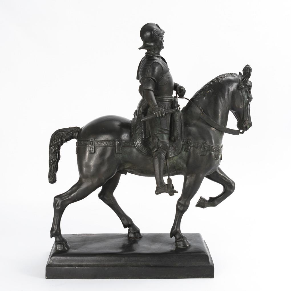 Large equestrian statue of the commander after the famous model in Venice. Kandare 1x broken off, patina partly rubbed and tarnished green.