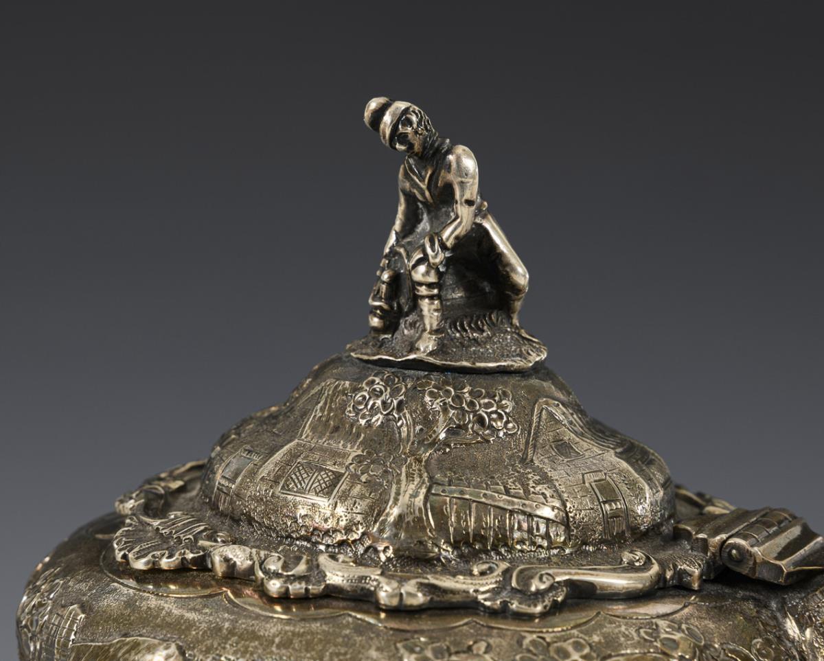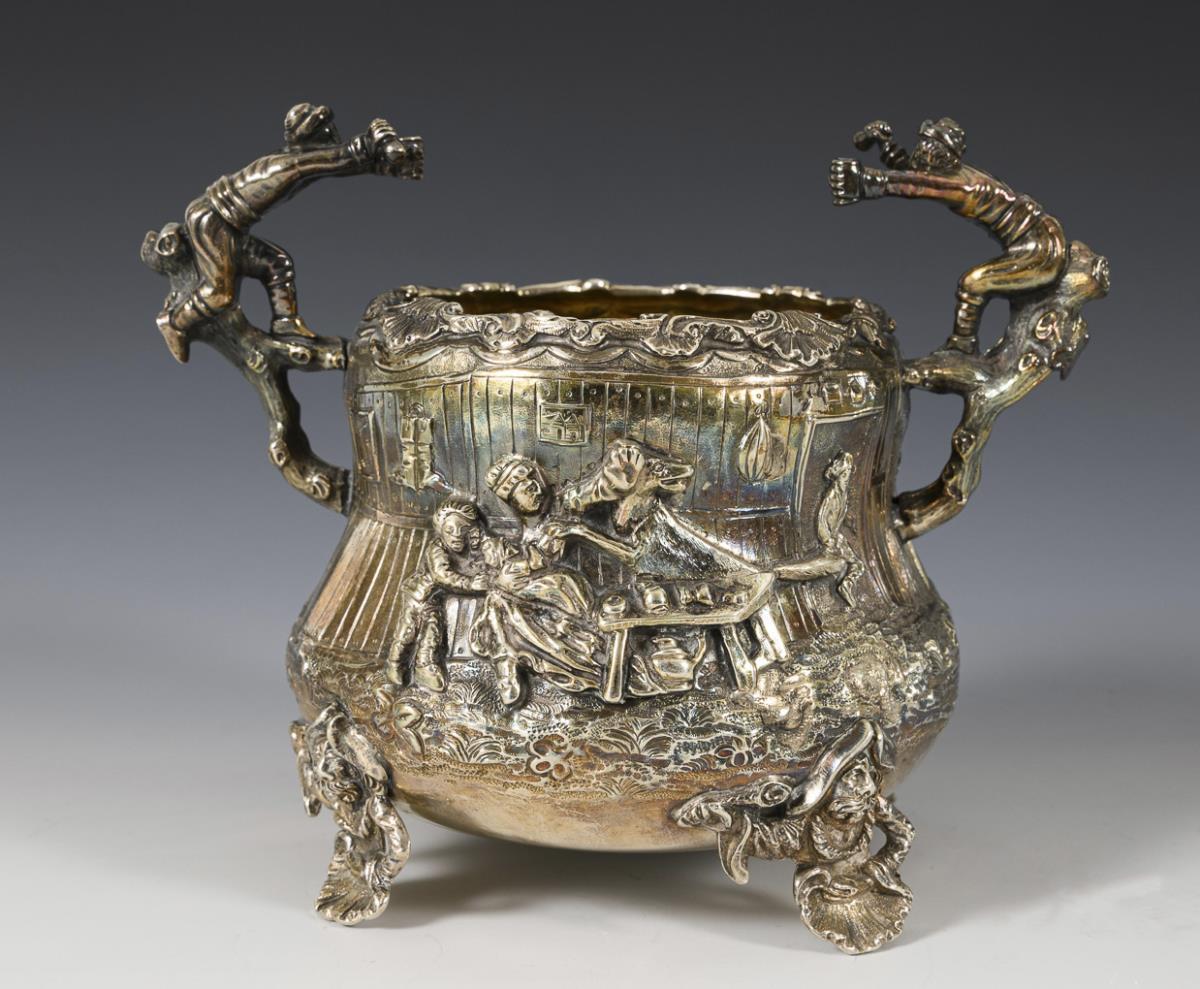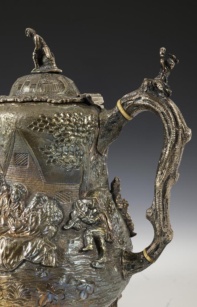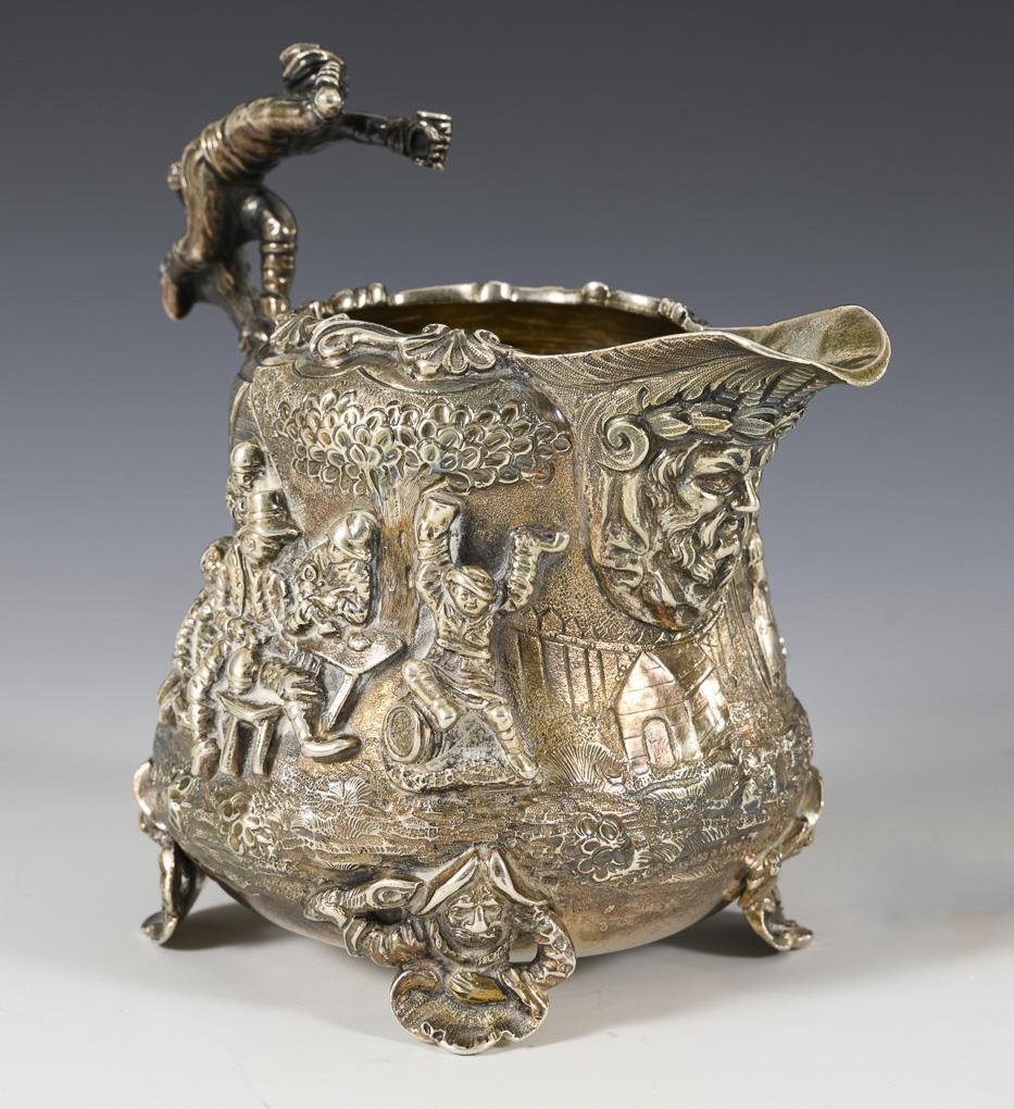 Heavy, richly relieved core piece with figure scenes: 2 jugs, sugar bowl and cream jug. In addition ergänztes oval tray from 1871 with coat of arms engraving and motto: "Fidus ad Finem", L 74 cm. Traces of use.