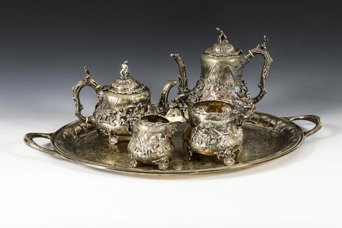 Ostentatious 4-piece silver set and heavy tray. Daniel & Charles Houle, London.