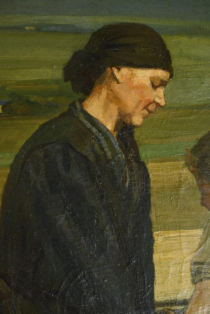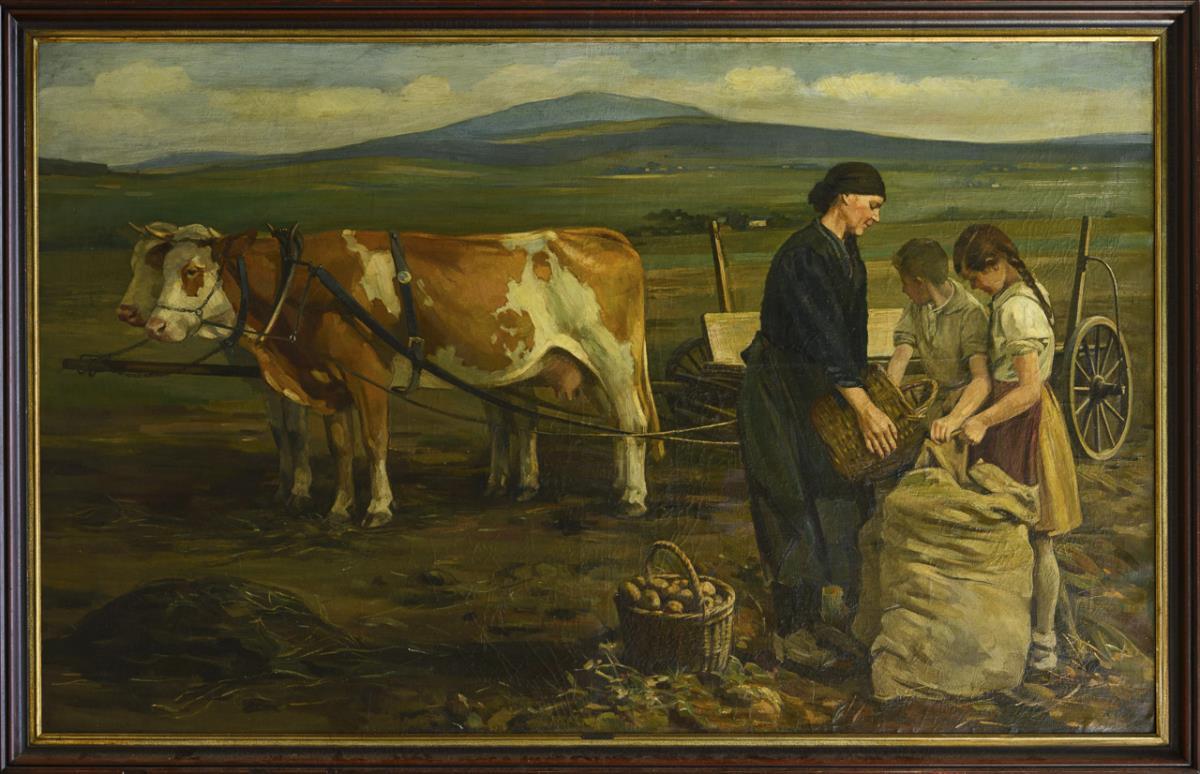 Large genre scene with Bäuerin and children near the cattle while filling the harvested potatoes in säcke. The picture was part of the Großen German Art Exhibition of 1942. Altersspuren.