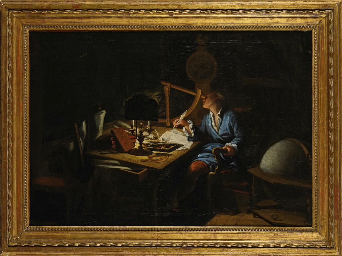 Scholarly young man in 18th century dress in candlelight watching the stars. Canvas doubled.