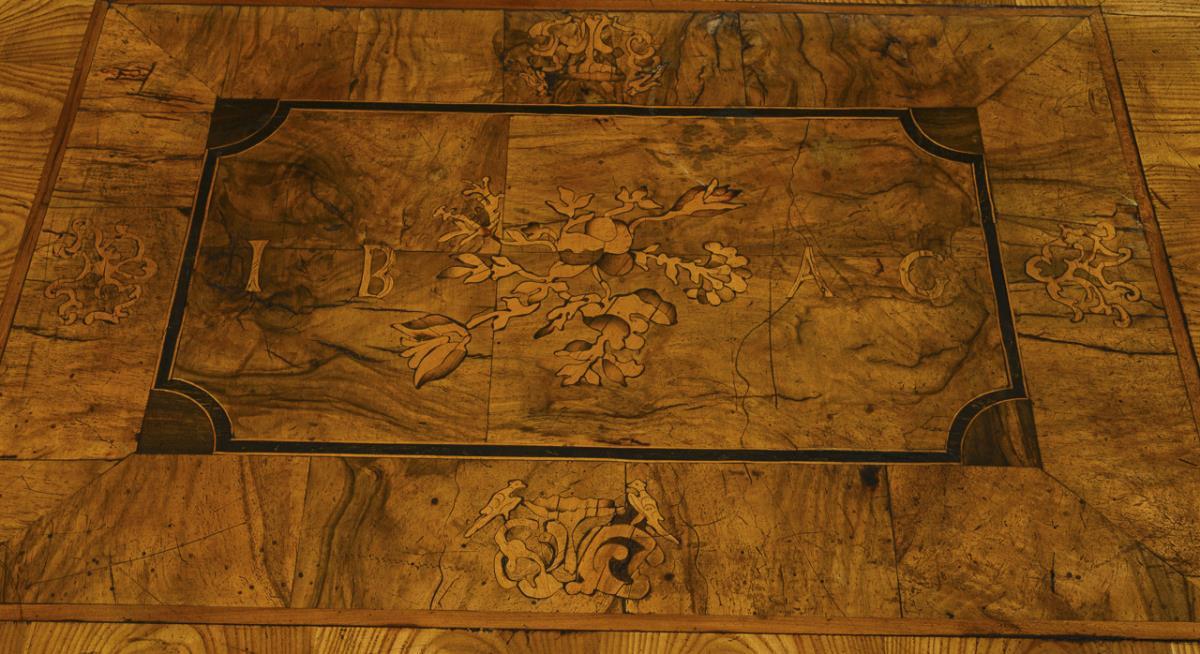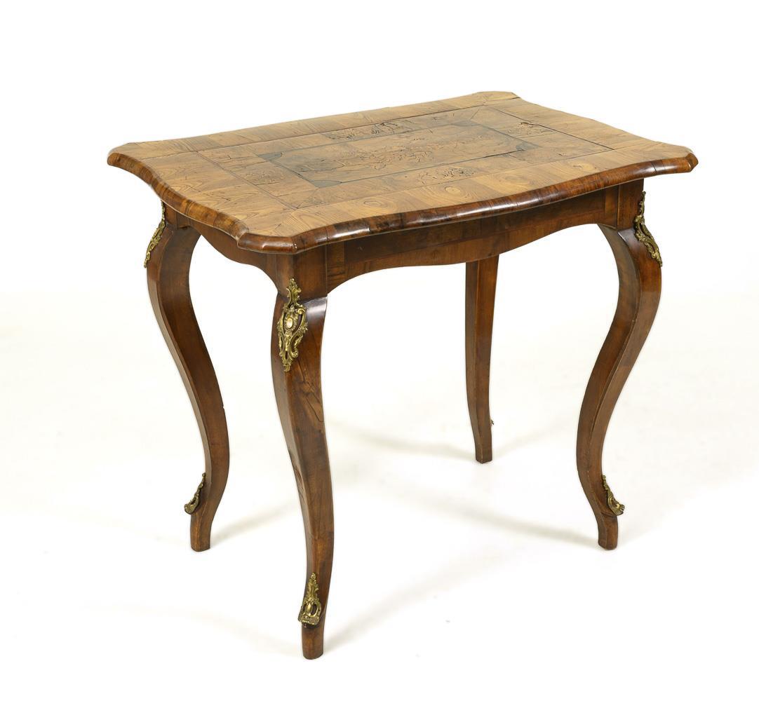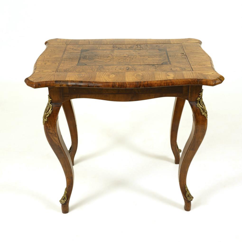 Small salon table in style-typical curved shape, table top decorated with coffered burl veneer and discreet vine inlays and the initials "IB and AG", legs decorated with bronze applications. Alt restored, signs of age / wear.