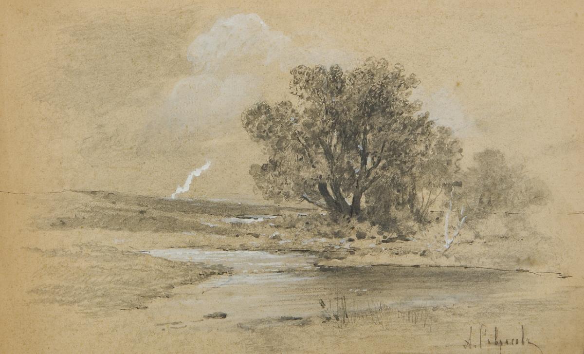 The landscape with central tree motif and quiet pond testifies to a romantic painting style. Passepartout, plain glazed frame. Frame partially defective.