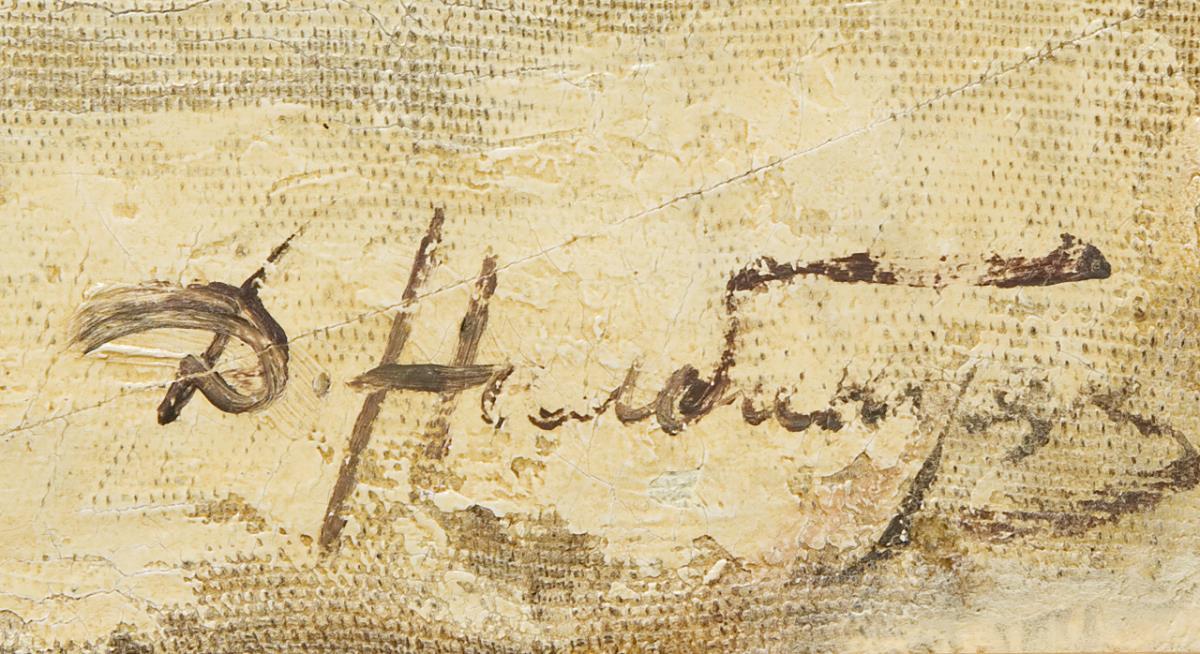The motif in idyllic naturalistic style conveys the mood of Eastern European melancholy. As good as new profile frame with narrow gilded stucco strip, white set. Partially Craquelé.