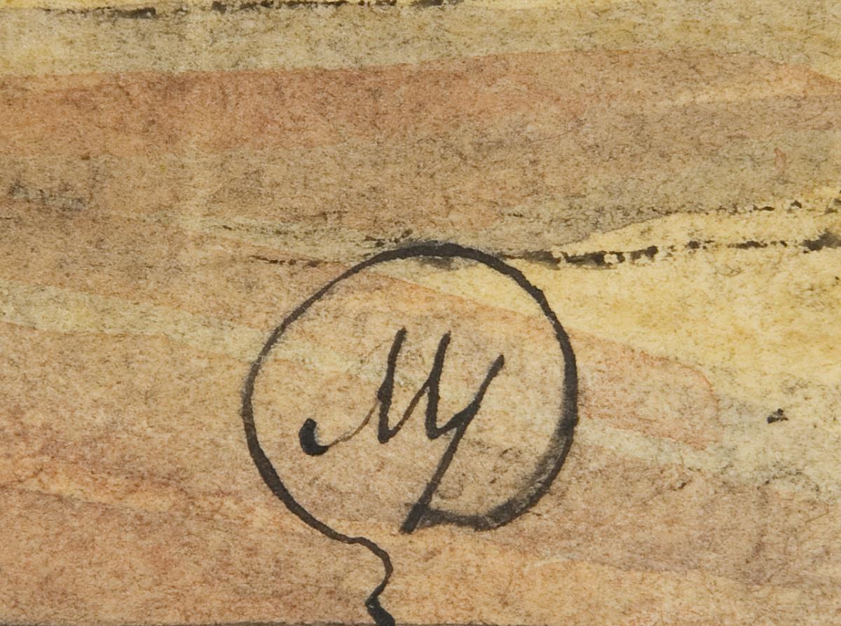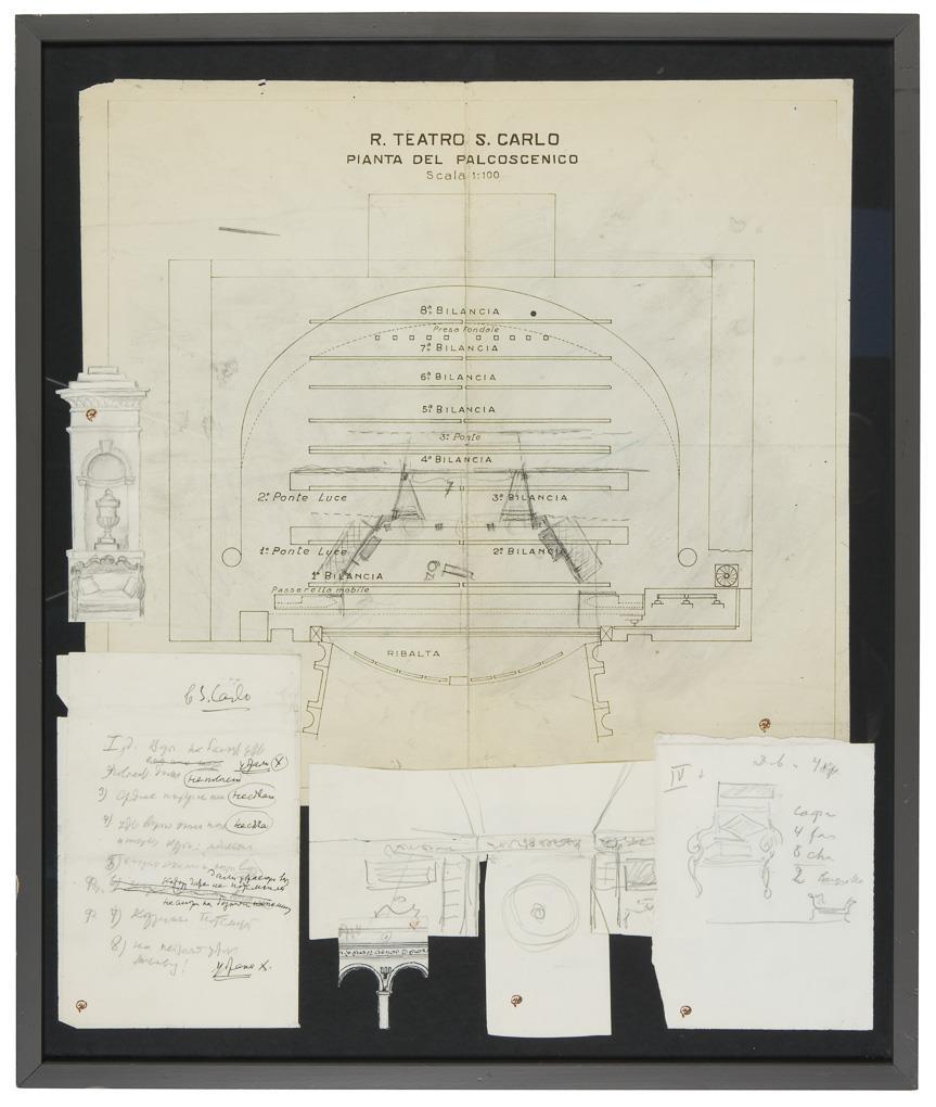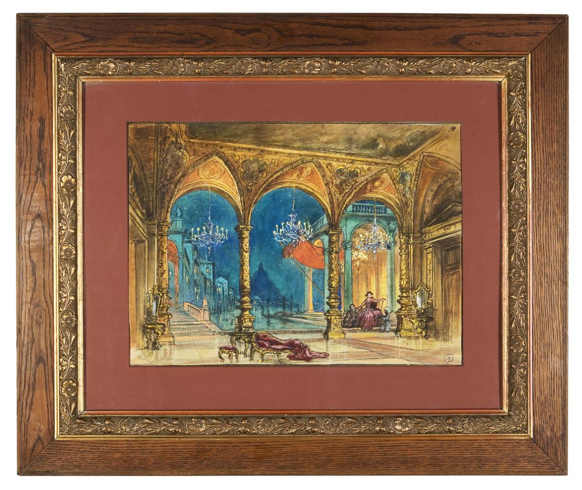 Pompous interior of a Venetian palazzo. Exceedingly detailed and finely painted. Included a stage floor plan with stage plan of the Teatro San Carlo in Naples, sketches and notes by the artist, all sheets with monogram stamp. Mounted, glazed frame with gilded stucco molding and as new glazed frame.